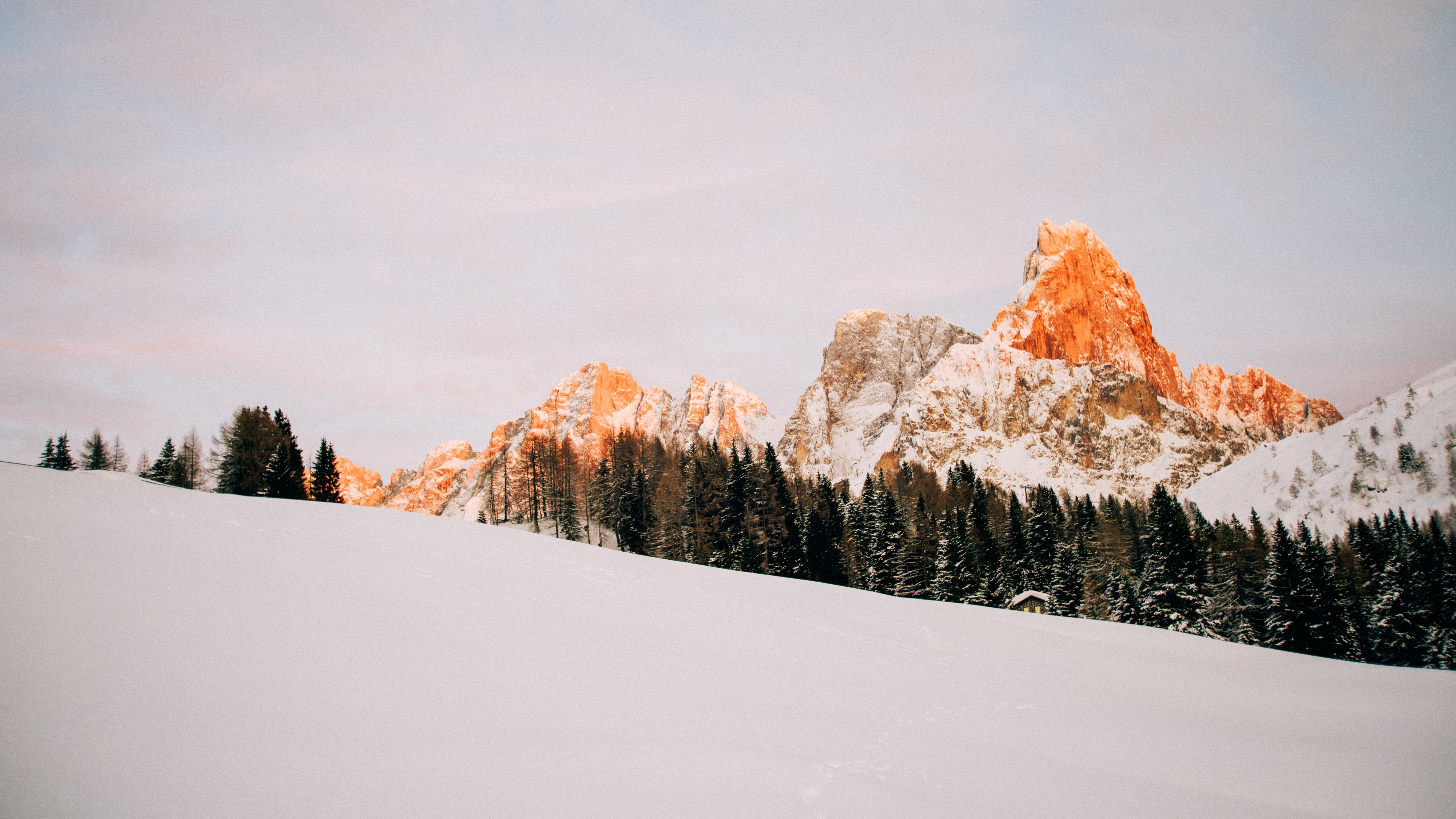 Description: A snow covered mountain with trees in the foreground and a sky background with clouds in the background and a pink sky.