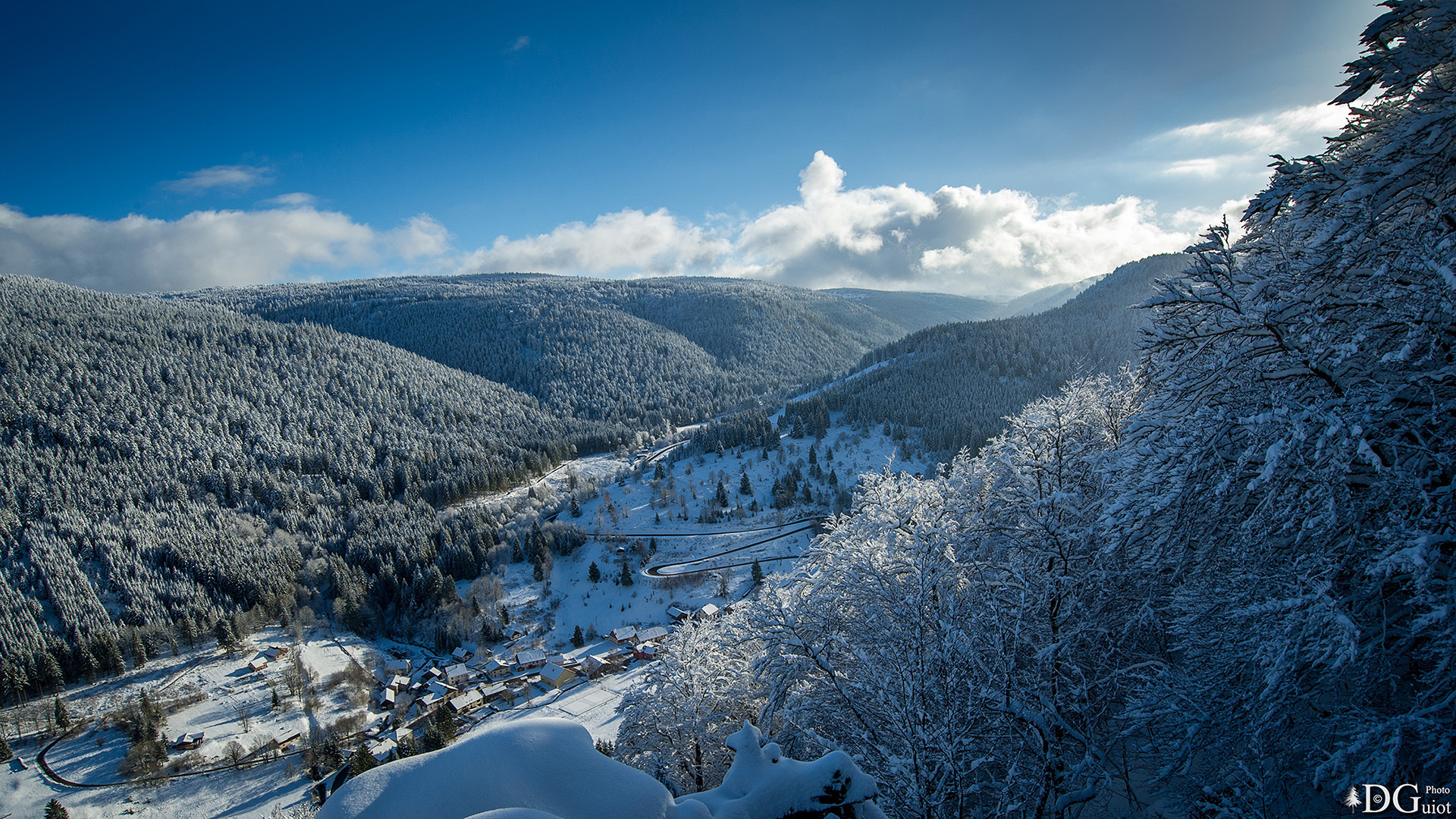 Description: A snowy mountain with a valley and a forest in the background and a blue sky with clouds above it.