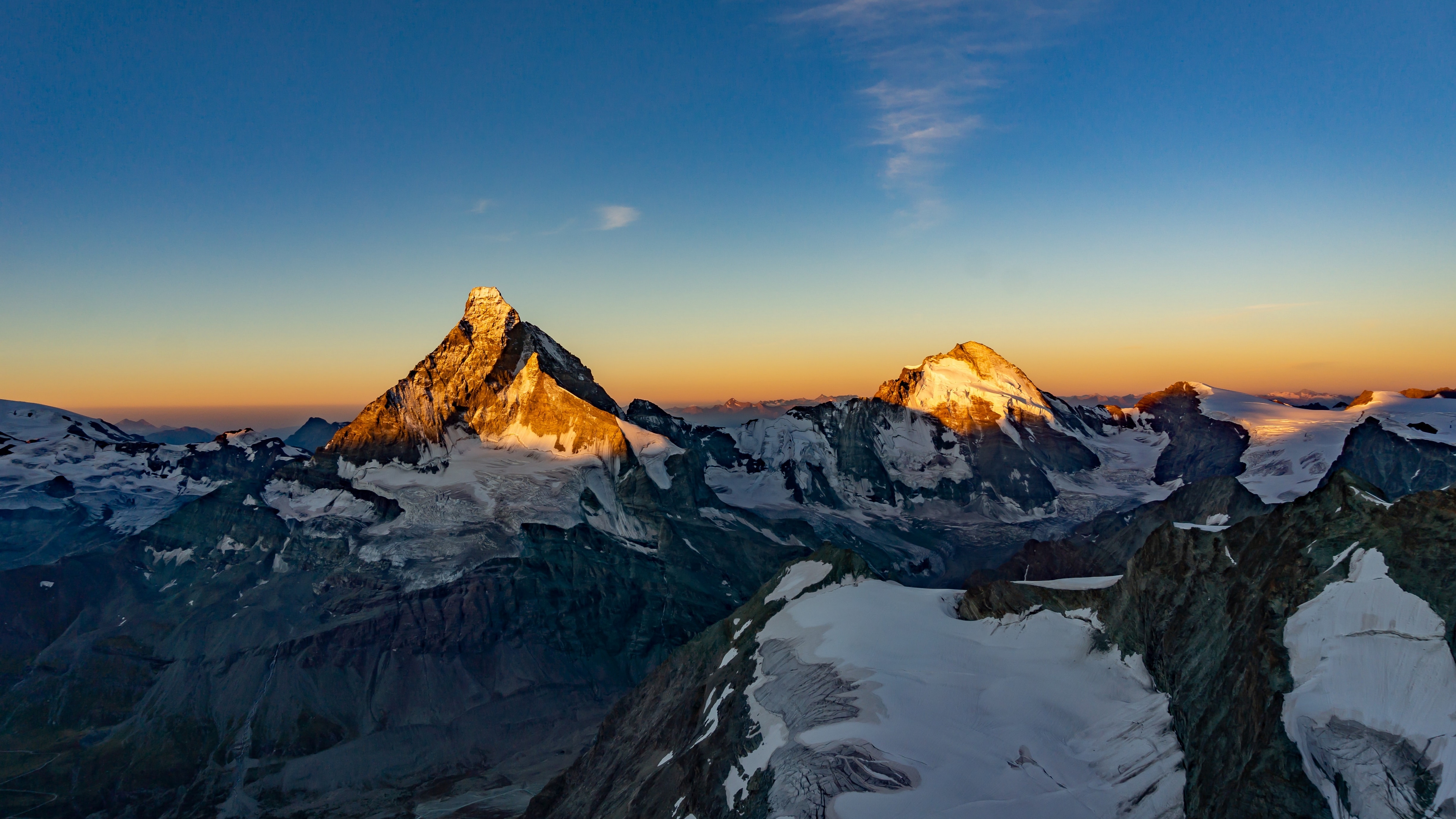 Description: A mountain range with snow covered mountains in the background at sunset or dawn with a few clouds in the sky.