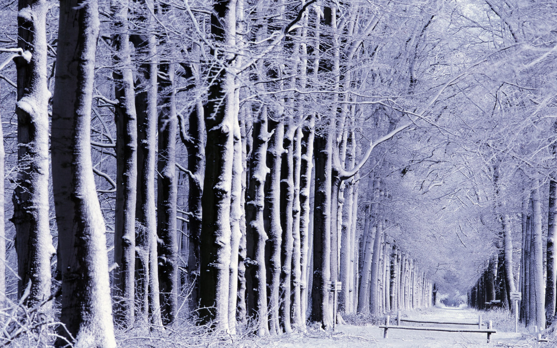 Description: A snowy path in a forest with benches and trees on either side of the path and a bench on the other side.