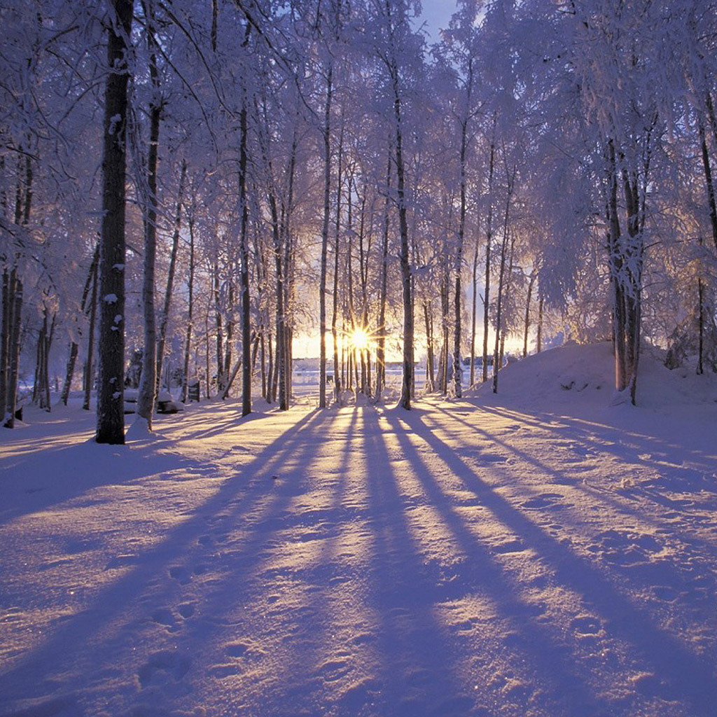 Description: A snowy path in a forest with the sun shining through the trees and the snow on the ground is almost white.