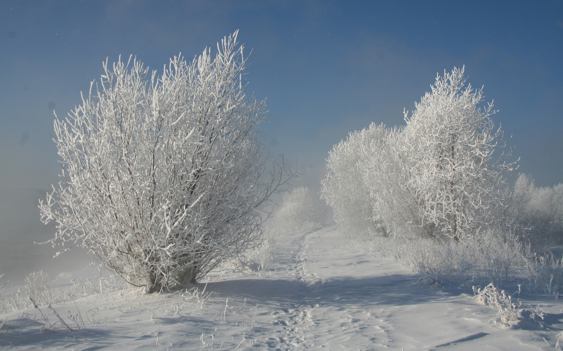 Description: A snowy path with trees and bushes on either side of it and a blue sky in the background with clouds.