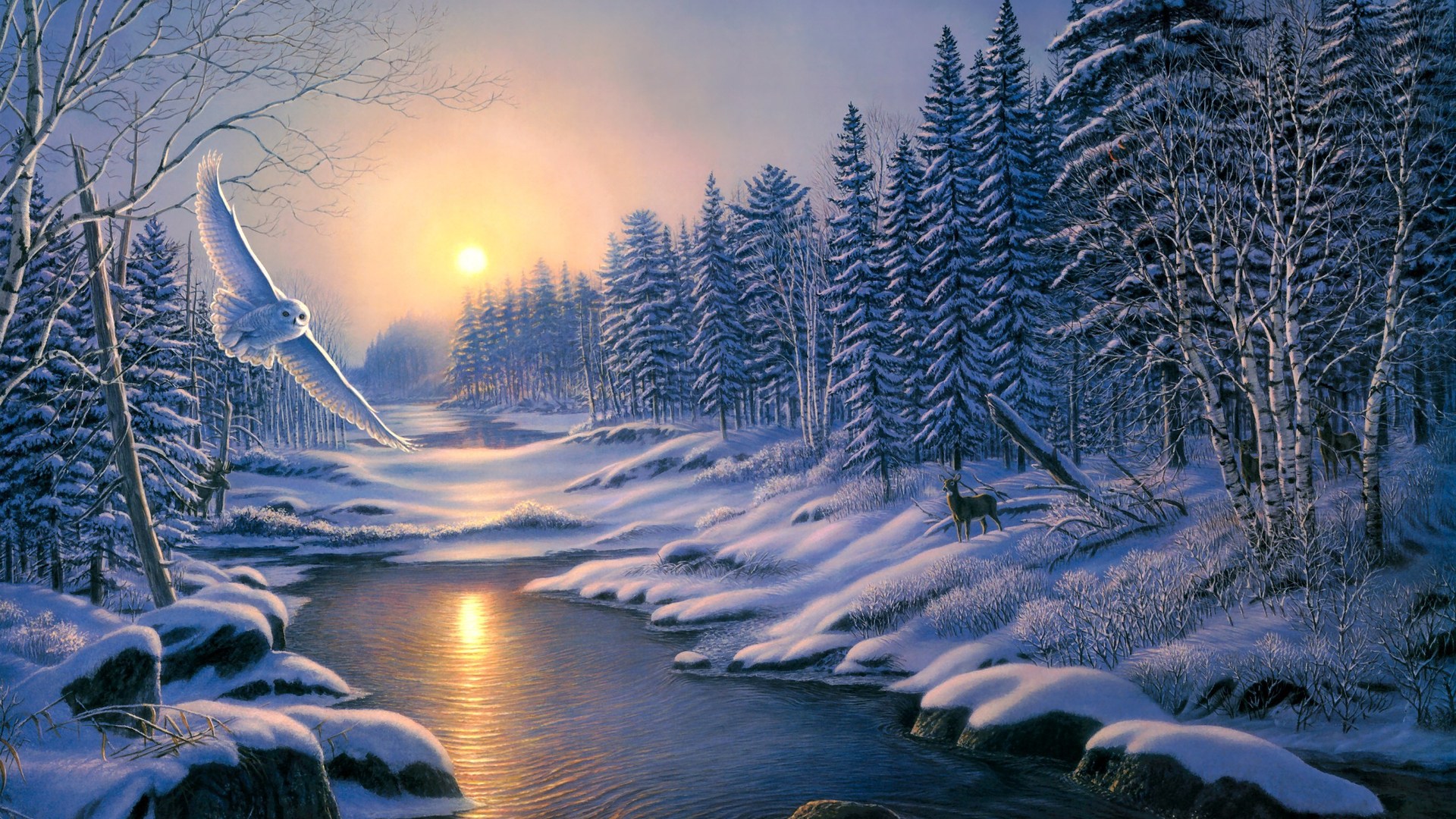 Description: A painting of a snowy river with a bird flying over it and a forest with snow covered trees and a sun setting.