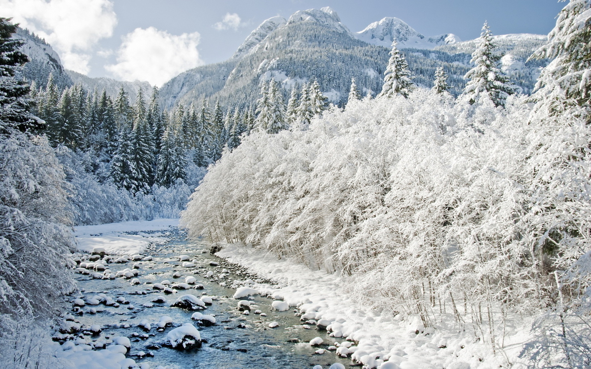 Description: A river running through a forest covered in snow next to a mountain range with trees covered in snow and snow.