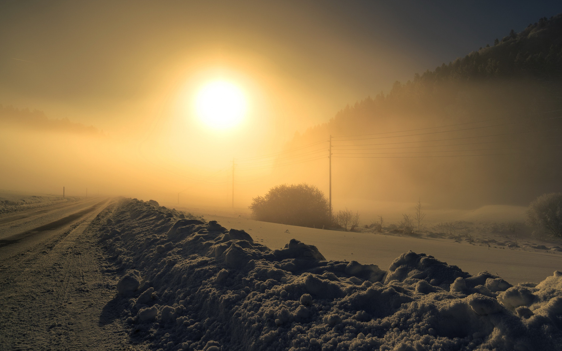 Description: A road covered in snow with the sun shining through the fog and trees in the distance in the distance.