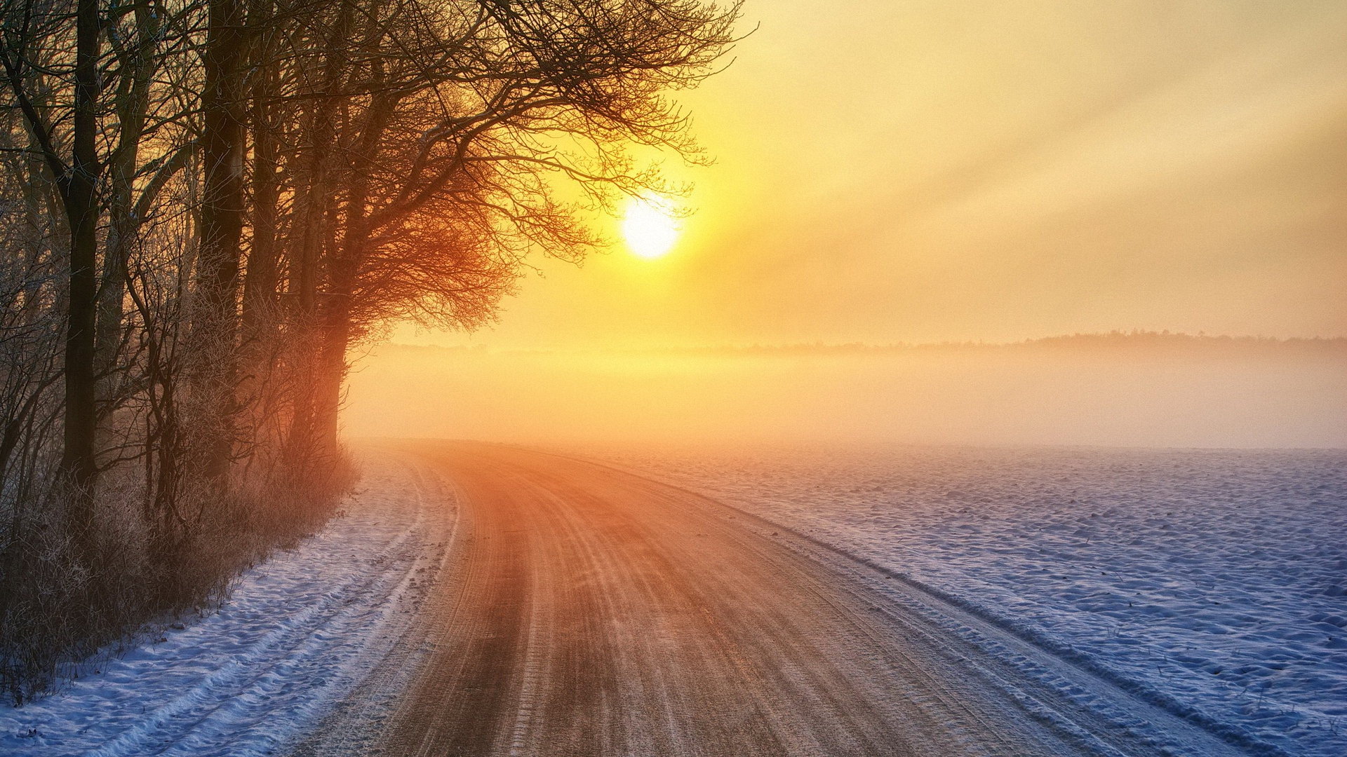 Description: A road with a snow covered field and trees on both sides of it at sunset or dawn with the sun shining through the trees.