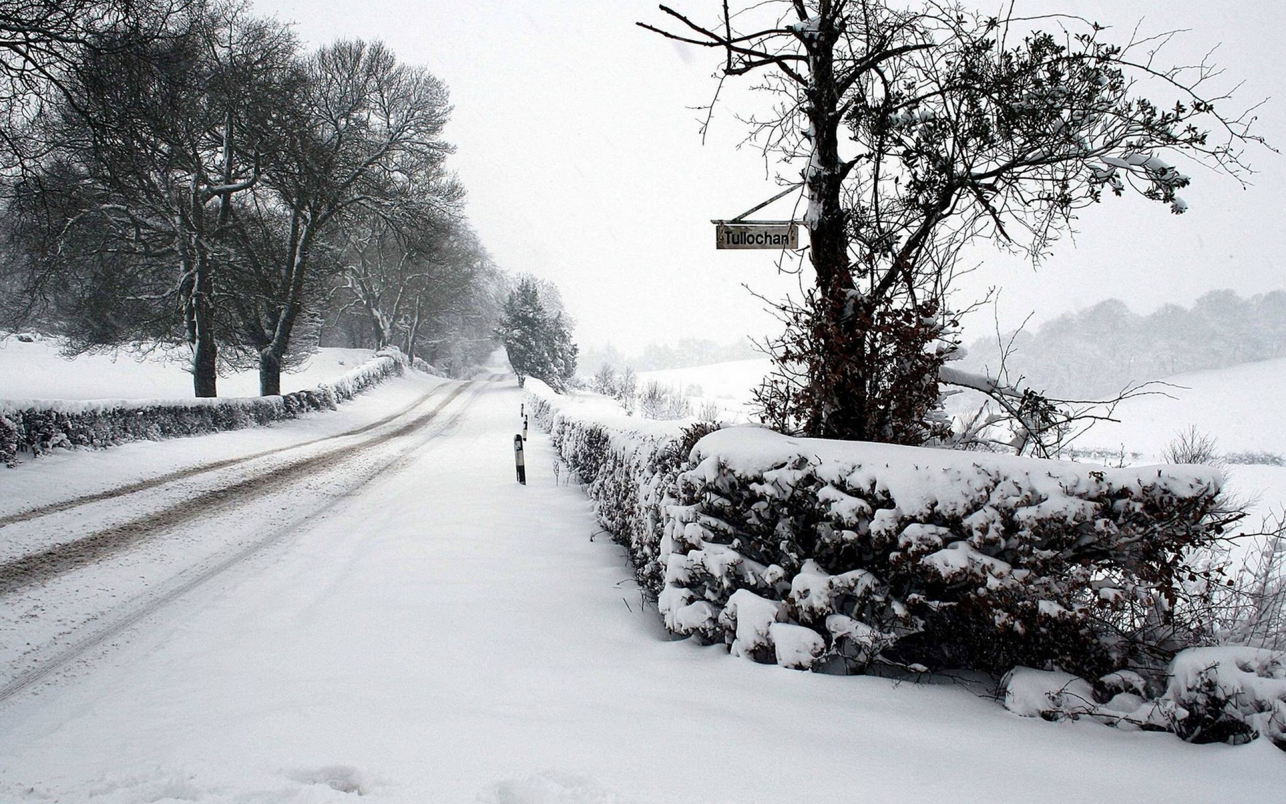Description: A snowy road with a sign on it and a tree in the middle of the road and a person walking on the side of the road.