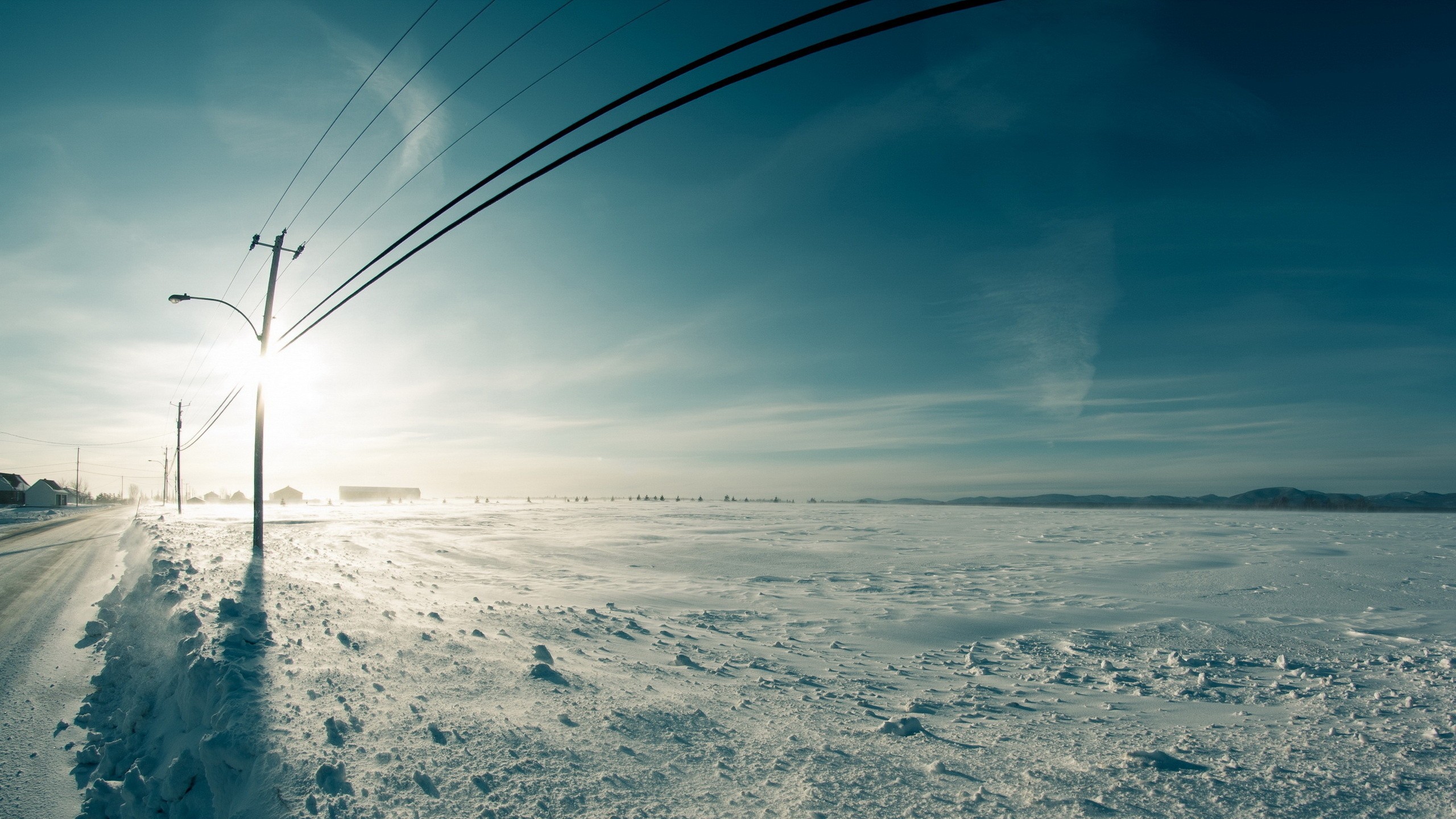 Description: A road with a telephone pole and a street light in the snow with the sun shining through the clouds.