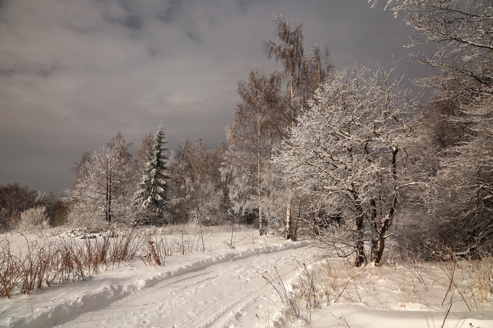 Description: A snowy road with trees and bushes on both sides of it and a cloudy sky above it.