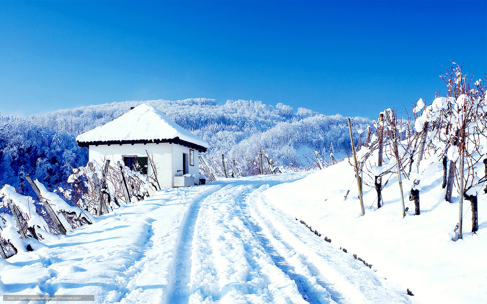 Description: A snowy road with a small white building in the background and trees in the foreground.