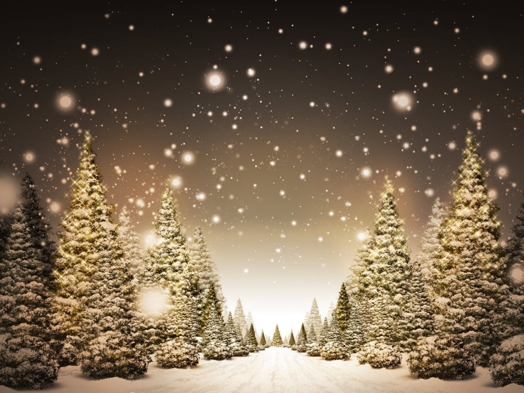 Description: A snowy scene with trees and snow flakes on the ground and a sky full of snow flakes.