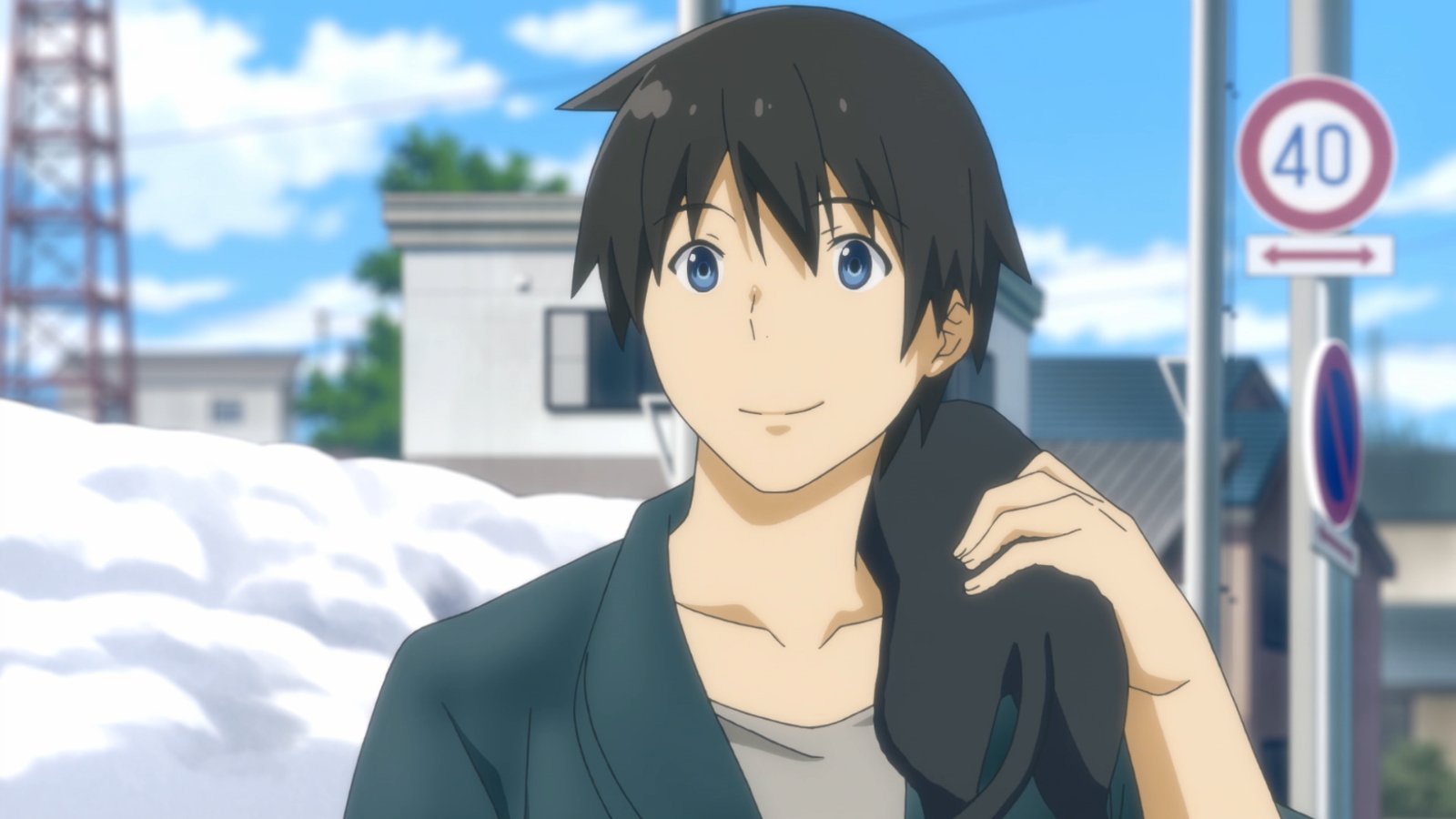 Description: A man standing in front of a snow covered street sign with a jacket on his shoulder and a jacket on his shoulder.