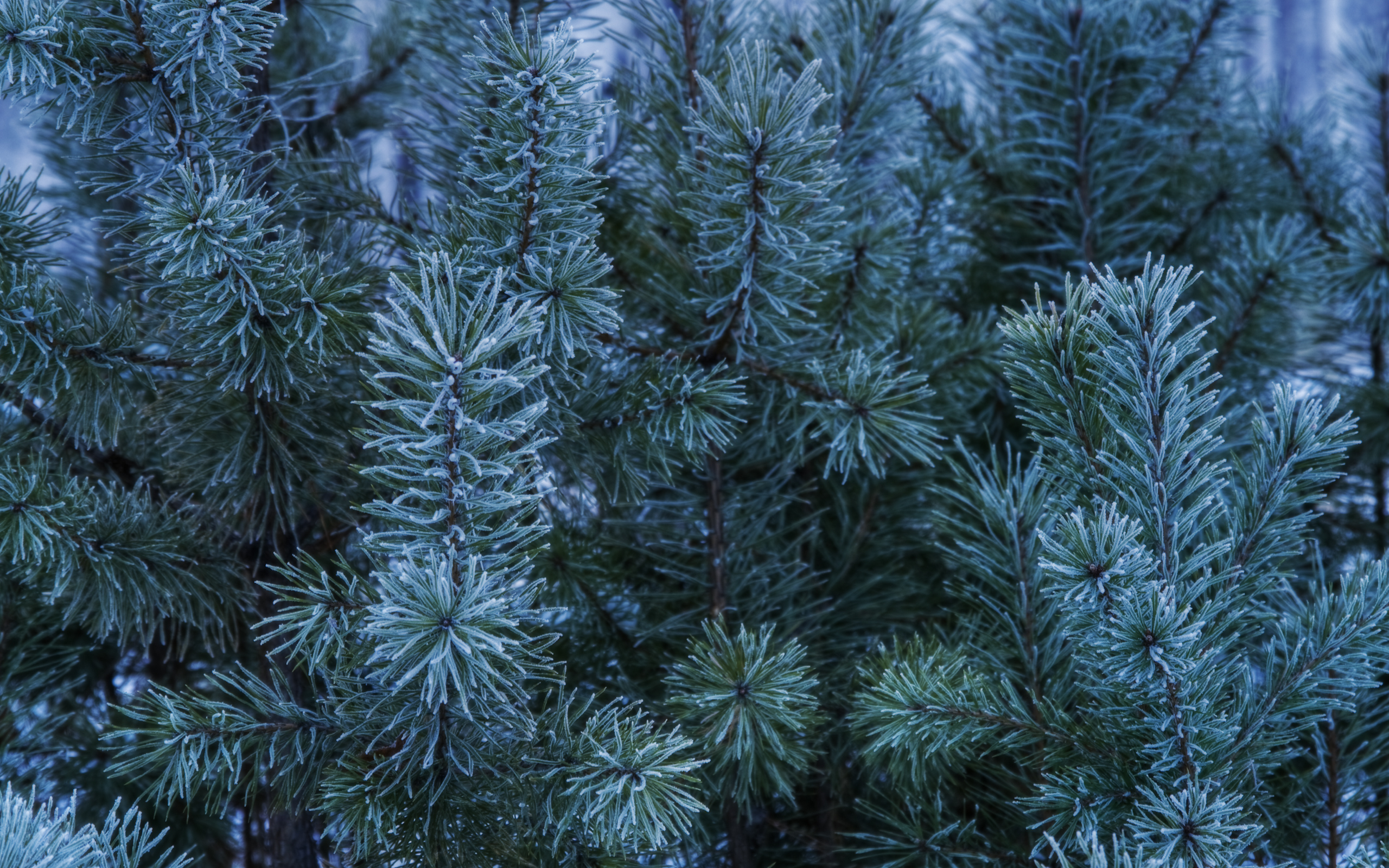 Description: A close up of a tree with snow on it's branches and branches with green needles and leaves.