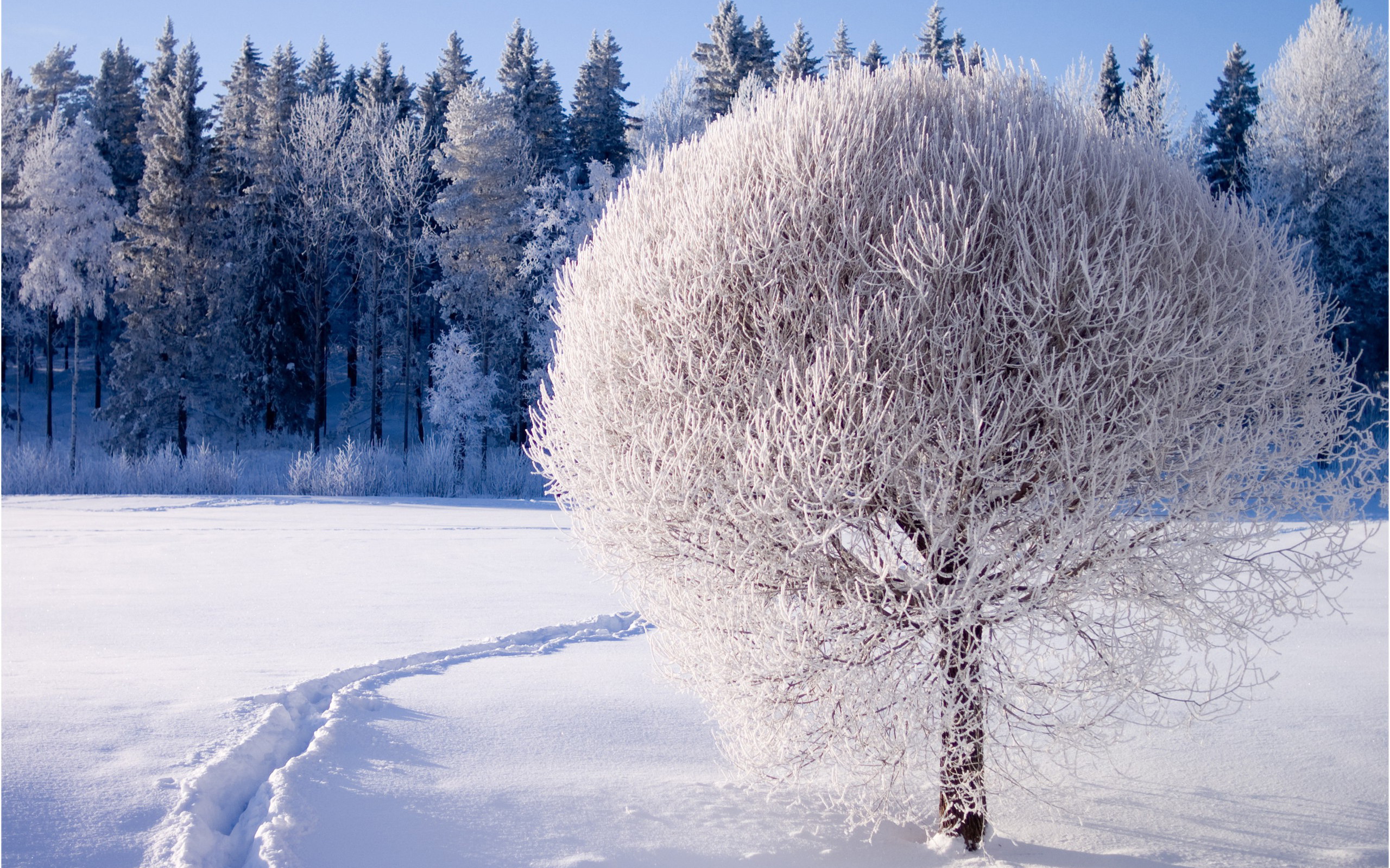 Description: A tree in the middle of a snowy field with a trail leading to it and a forest in the background.