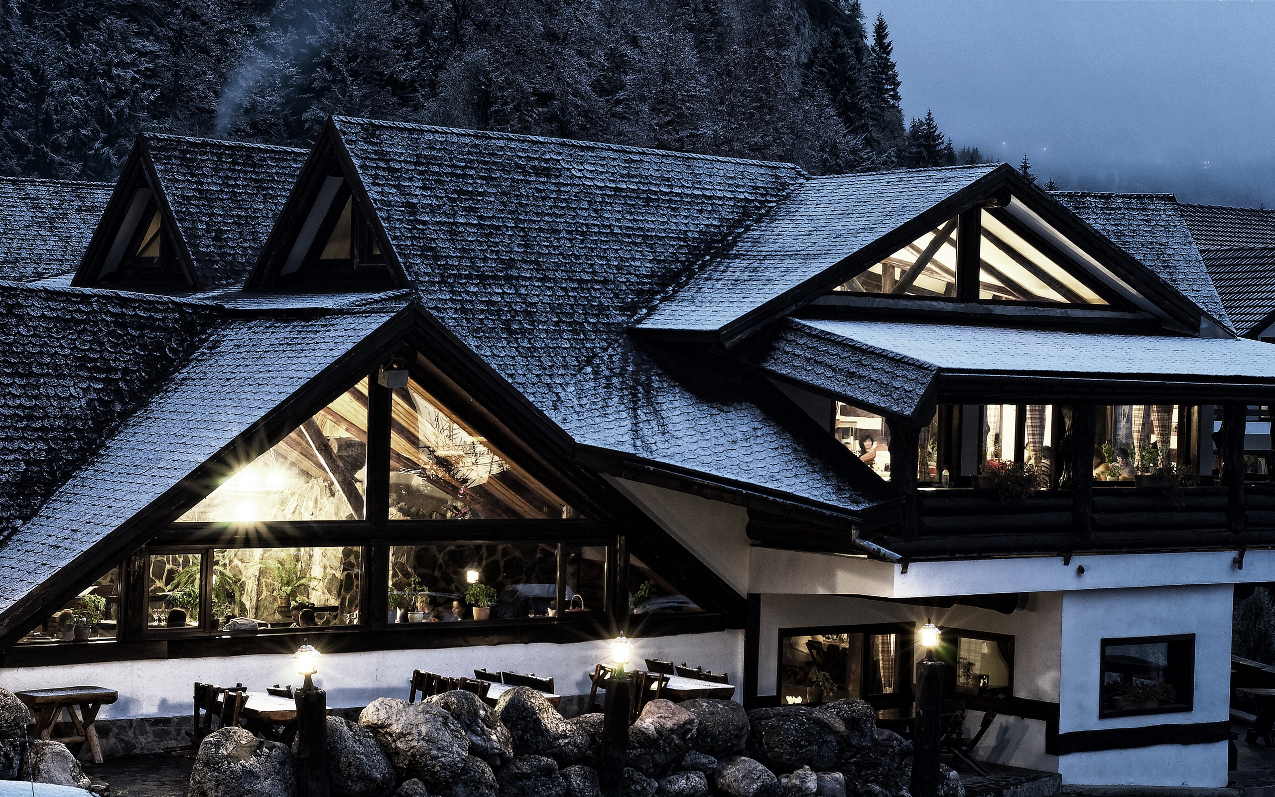 Description: A house with a lot of windows and a roof covered in snow and rocks and lights on the windows.