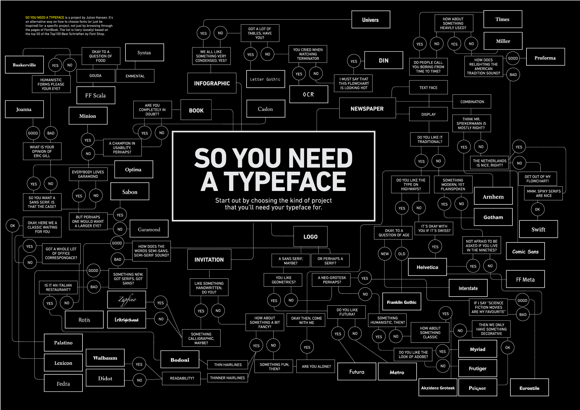 Description: A black and white poster with a bunch of words on it that says so you need a typeface.