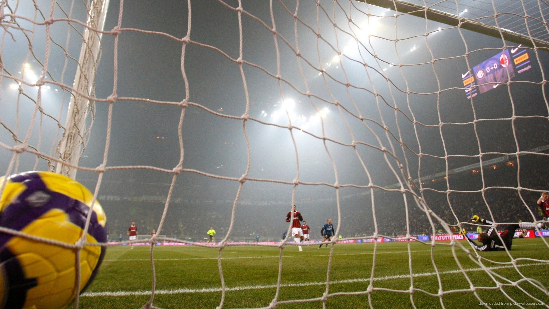 Description: A soccer ball is in the goal net as a crowd watches from the stands at a soccer game in a stadium.