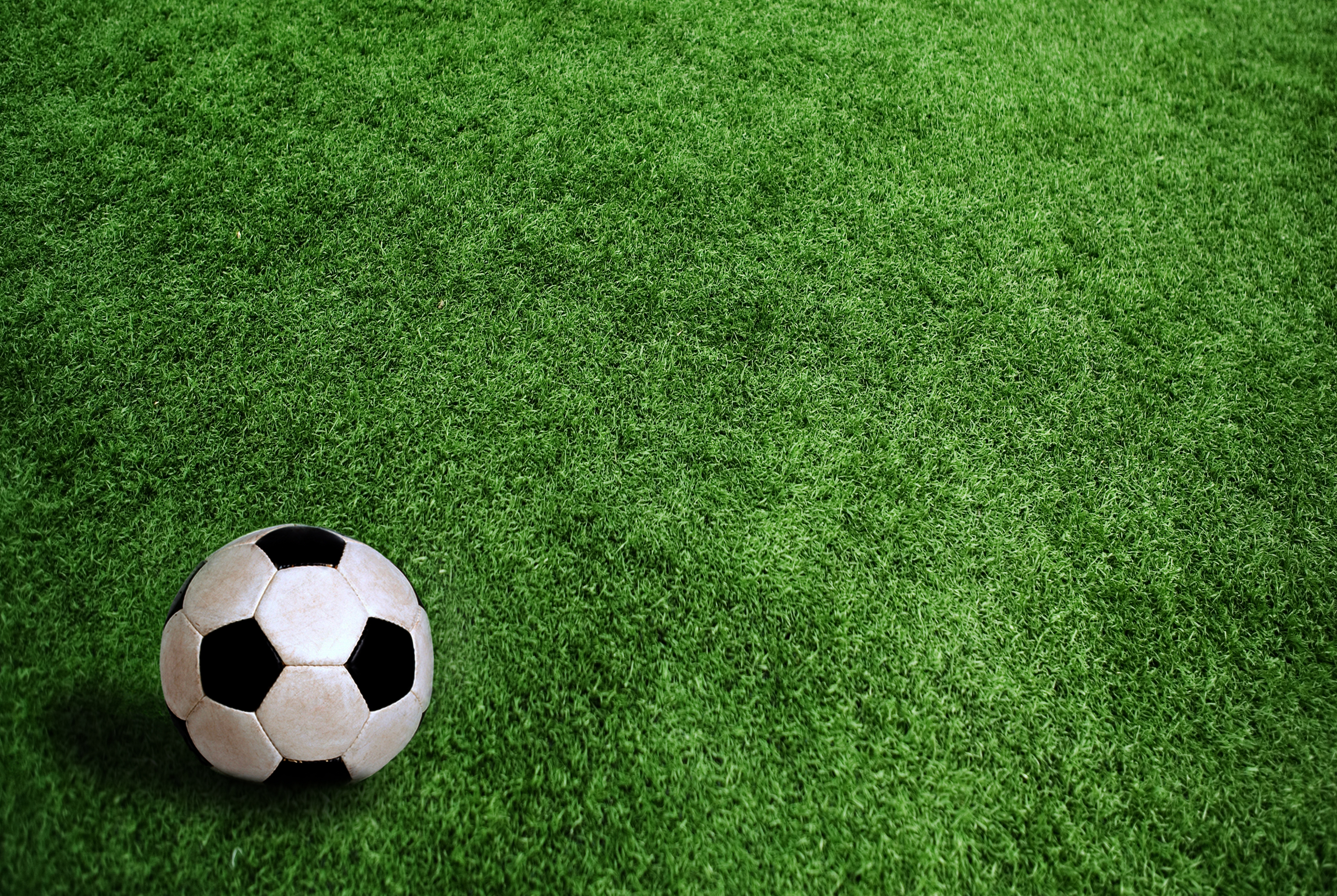 Description: A soccer ball sitting on top of a green field of grass with a black and white stripe on the side.