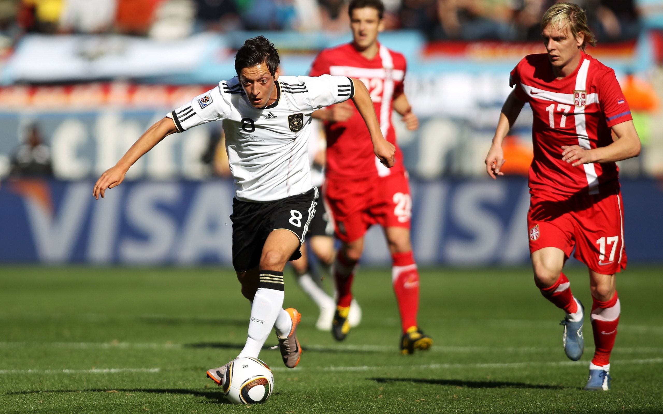 Description: A group of men playing a game of soccer on a field with people watching from the stands watching the ball.
