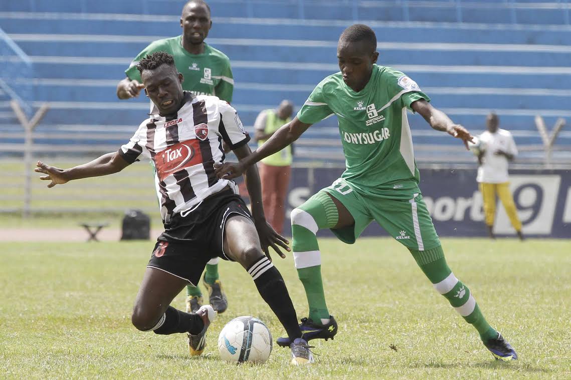 Description: A group of men playing a game of soccer on a field with a crowd watching them on the sidelines.