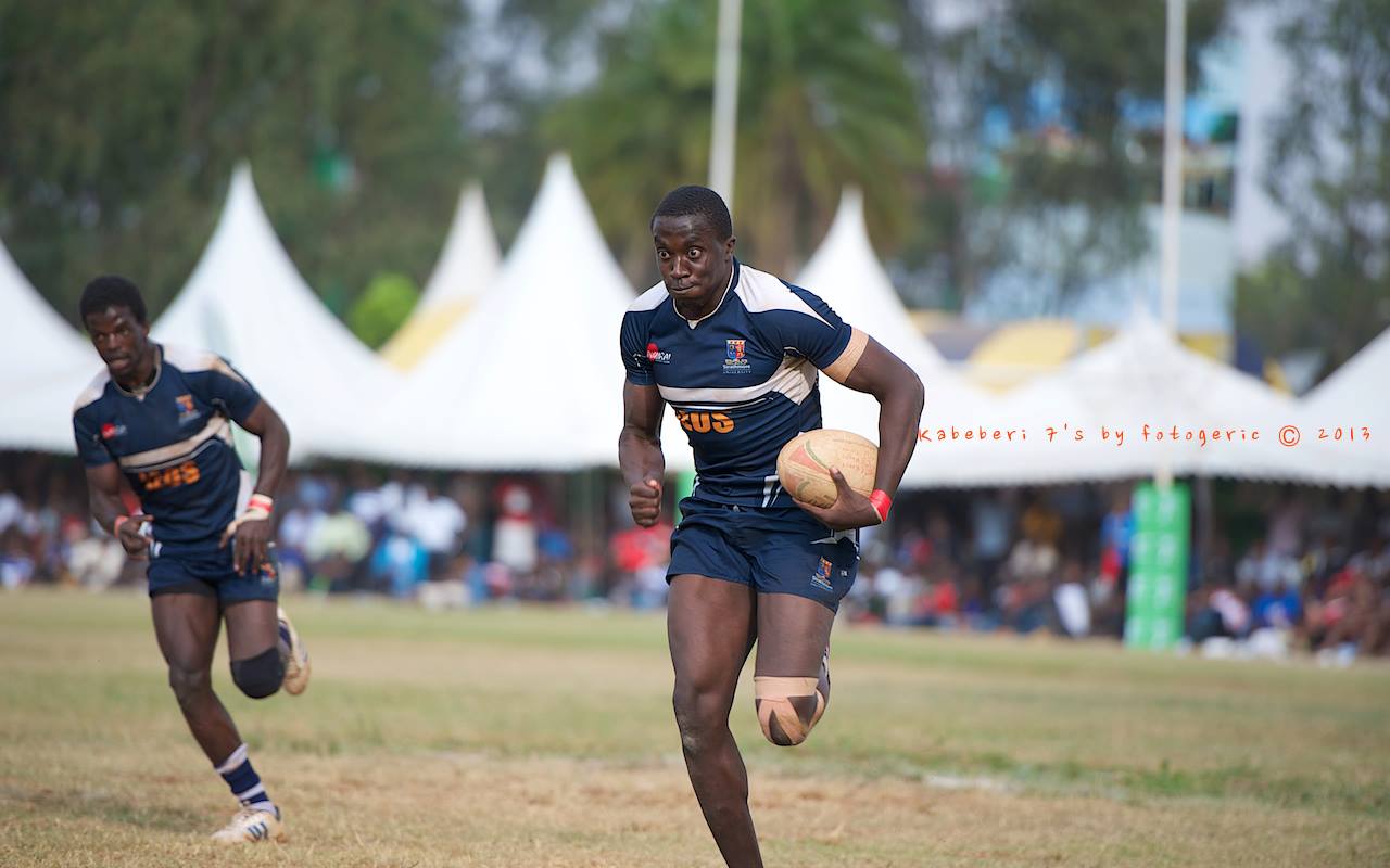 Description: A group of men playing a game of soccer on a field with tents in the background and people watching.