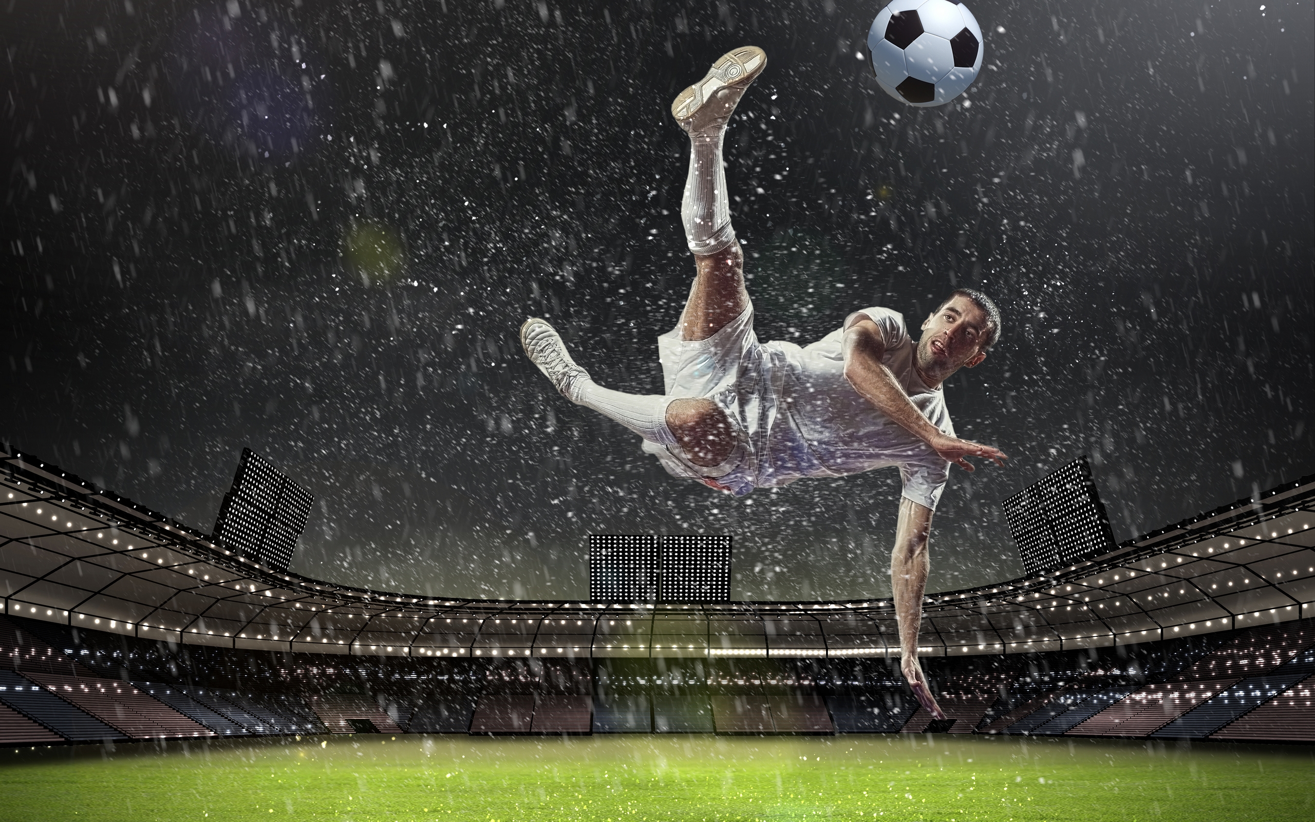 Description: A man kicking a soccer ball in the rain at a stadium with a stadium bleachers and lights.