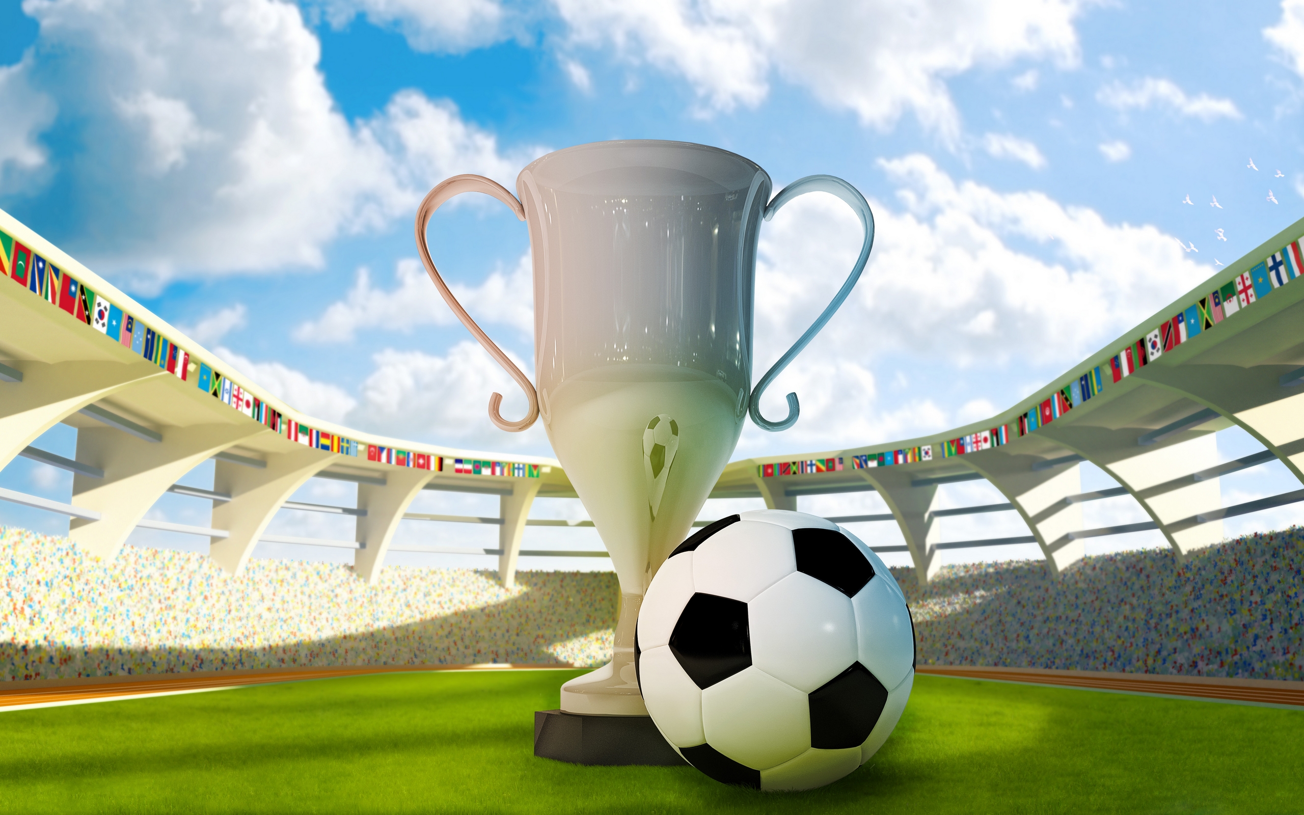 Description: A soccer ball and a trophy on a field of grass in a stadium with a sky background and clouds.
