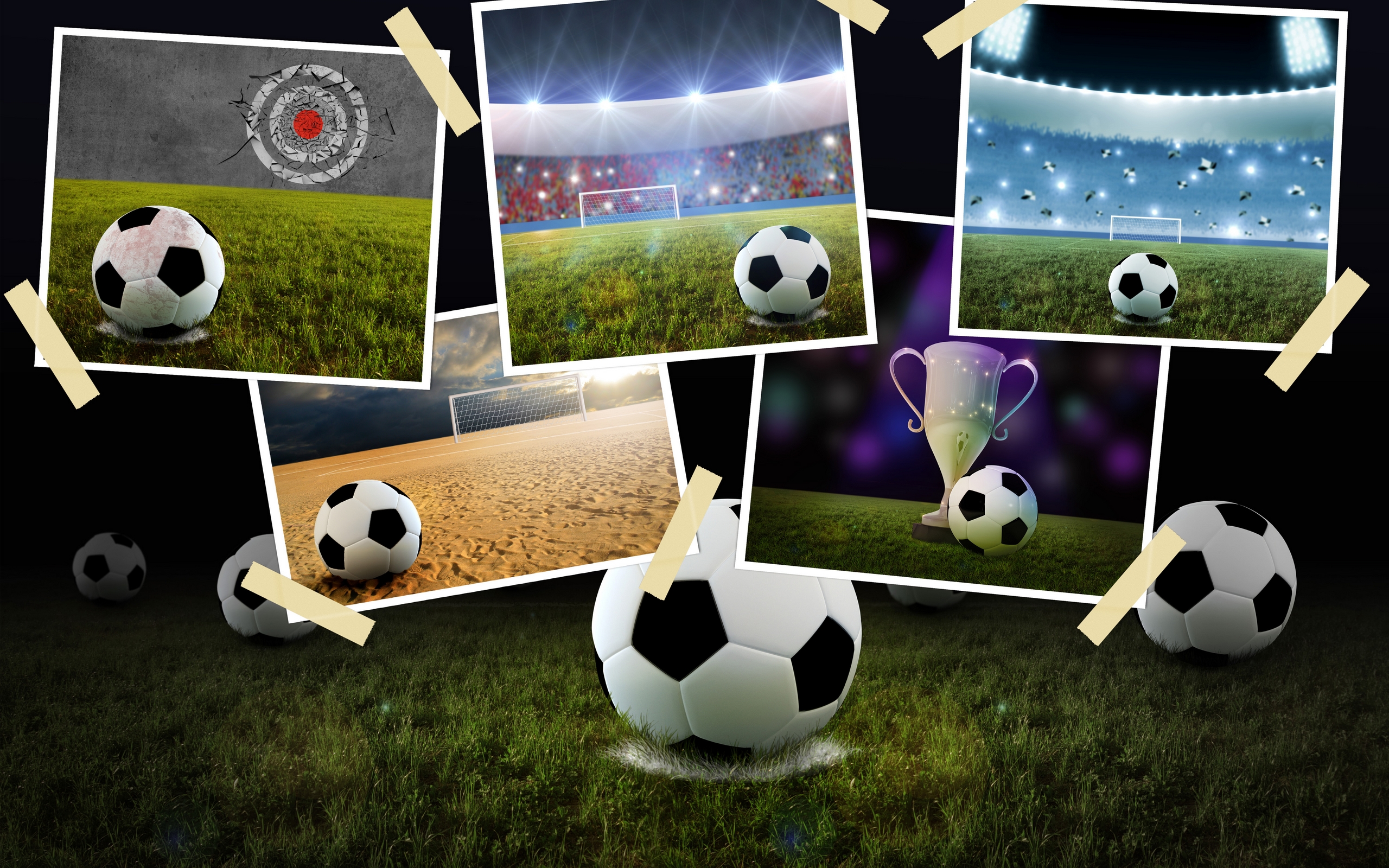 Description: A collage of photos of a soccer ball and a trophy on a field with a stadium in the background.