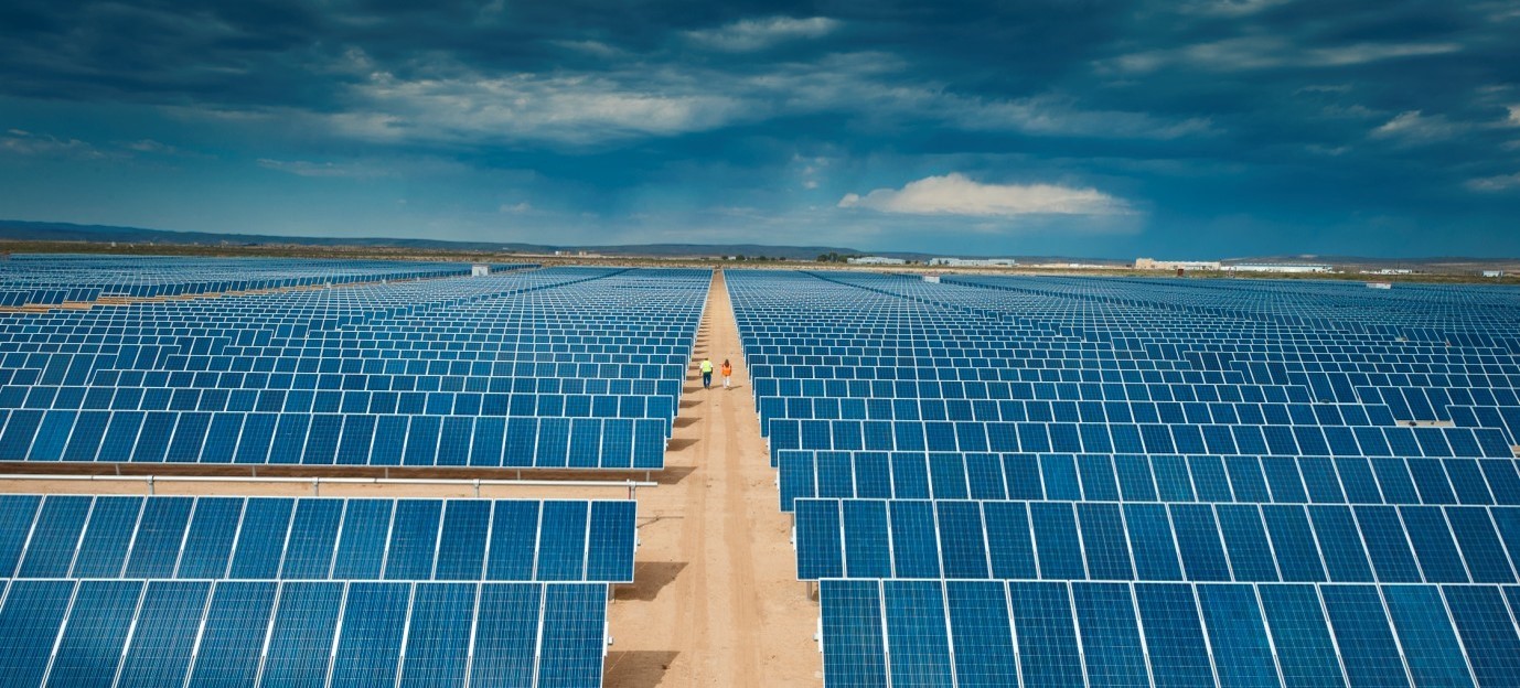 Description: A large solar farm with a sky background and a few people walking on the ground in the middle of the rows.