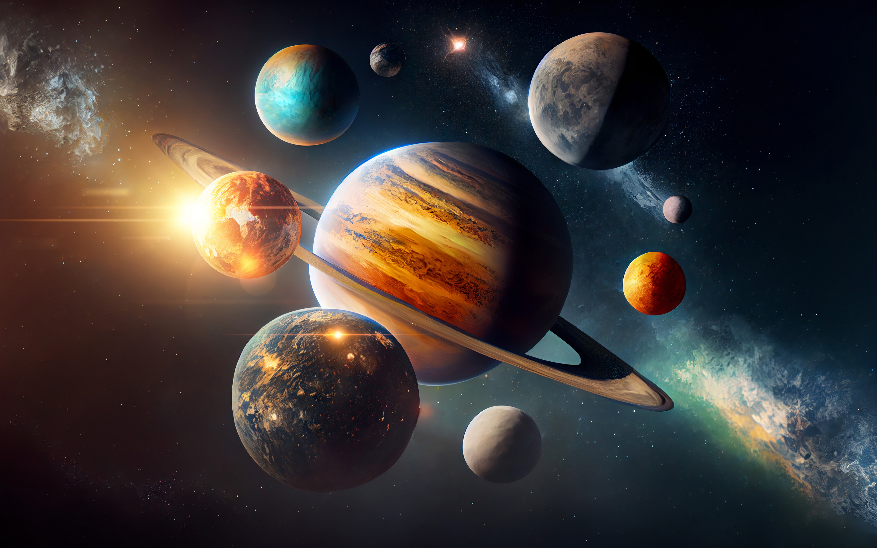 Description: A solar system with planets and stars in the background.