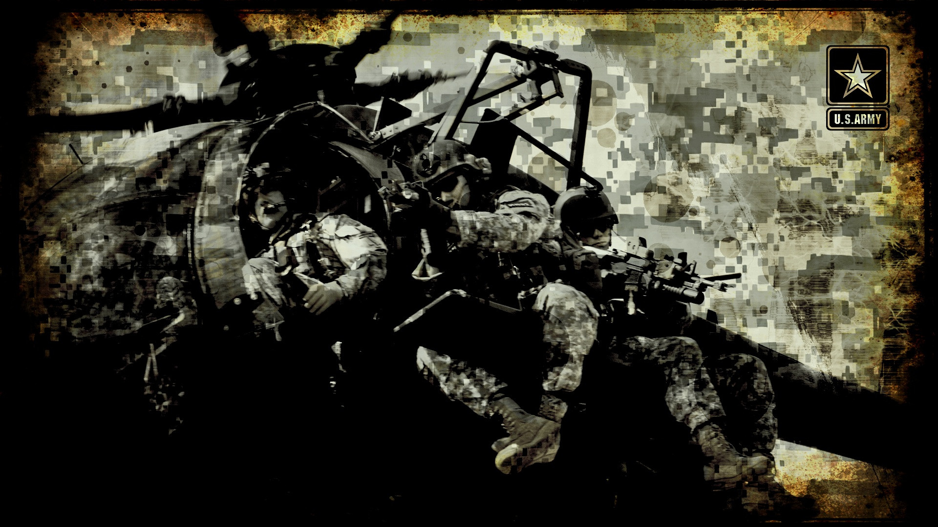 Description: A soldier with a machine gun in his hand and a camouflage background with a text overlay that reads.