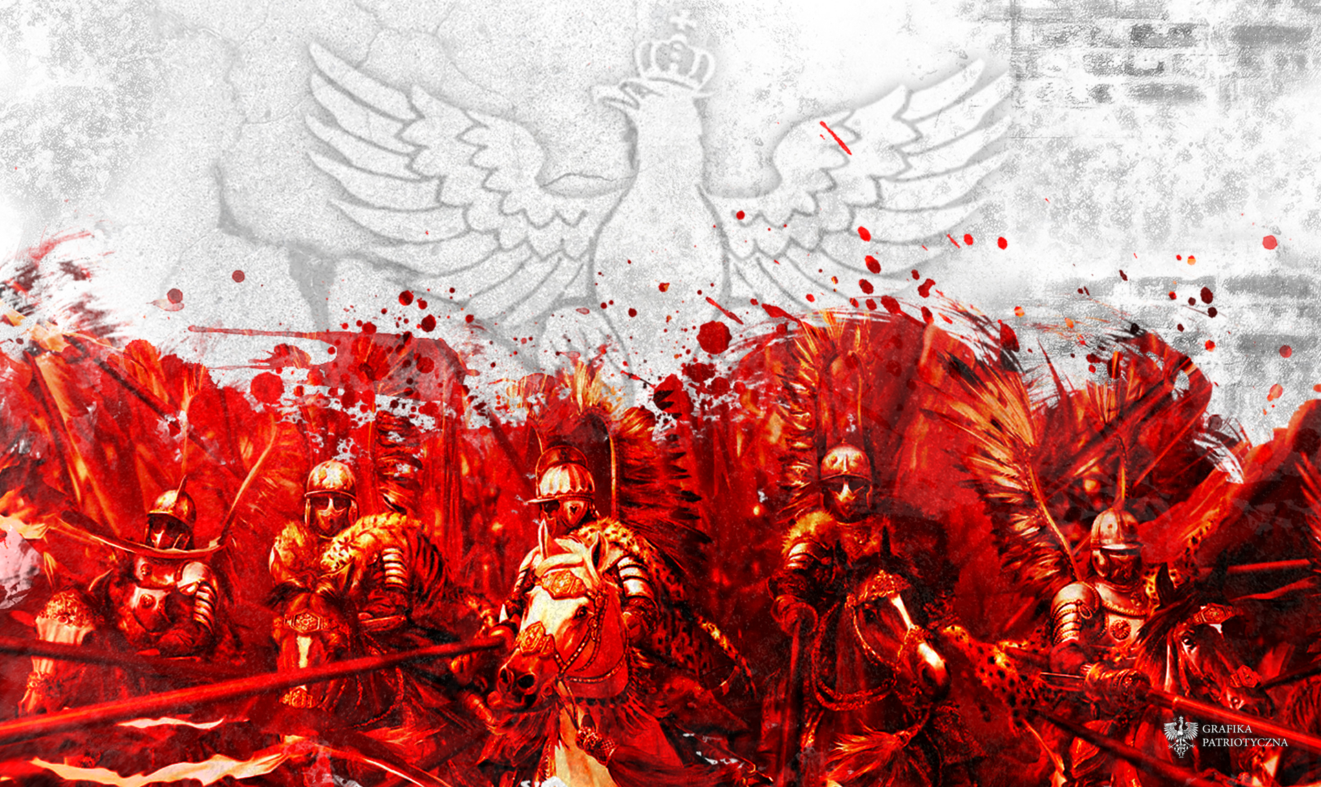 Description: A painting of a group of soldiers with red paint on them and a bird above them.