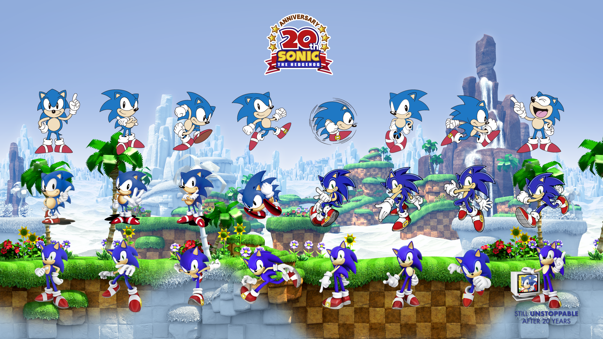 Description: A bunch of sonic characters in a game with a city background and a sky background with buildings and trees.