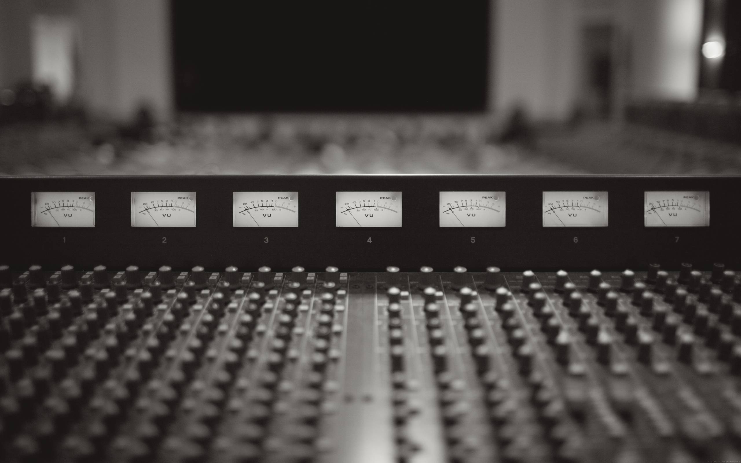 Description: A sound board with multiple knobs and a large screen in the background with lights on it and a row of chairs.