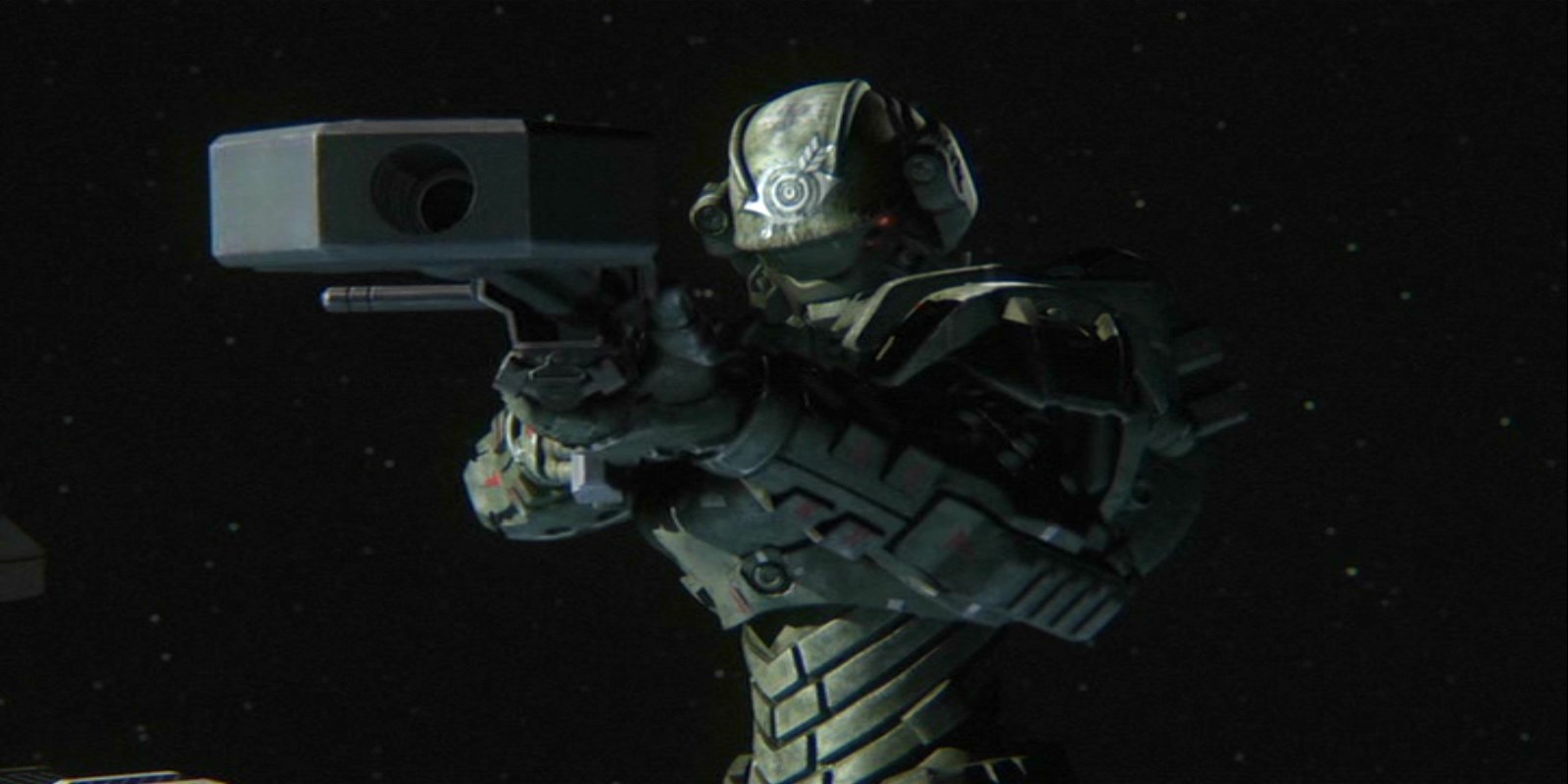 Description: A man in a space suit holding a gun in front of a space station with a rocket ship in the background.