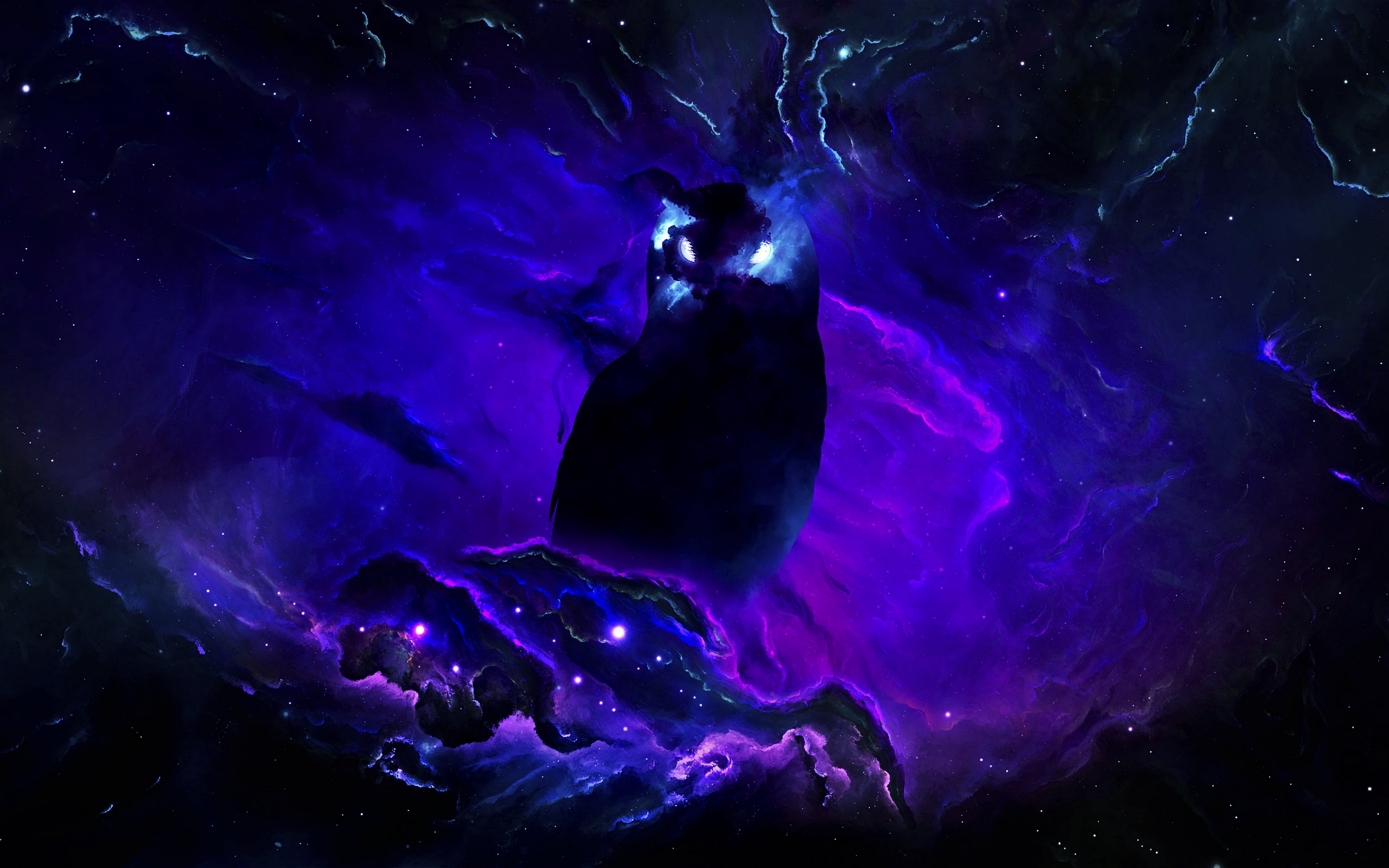 Description: A man standing in the middle of a space filled with stars and clouds.