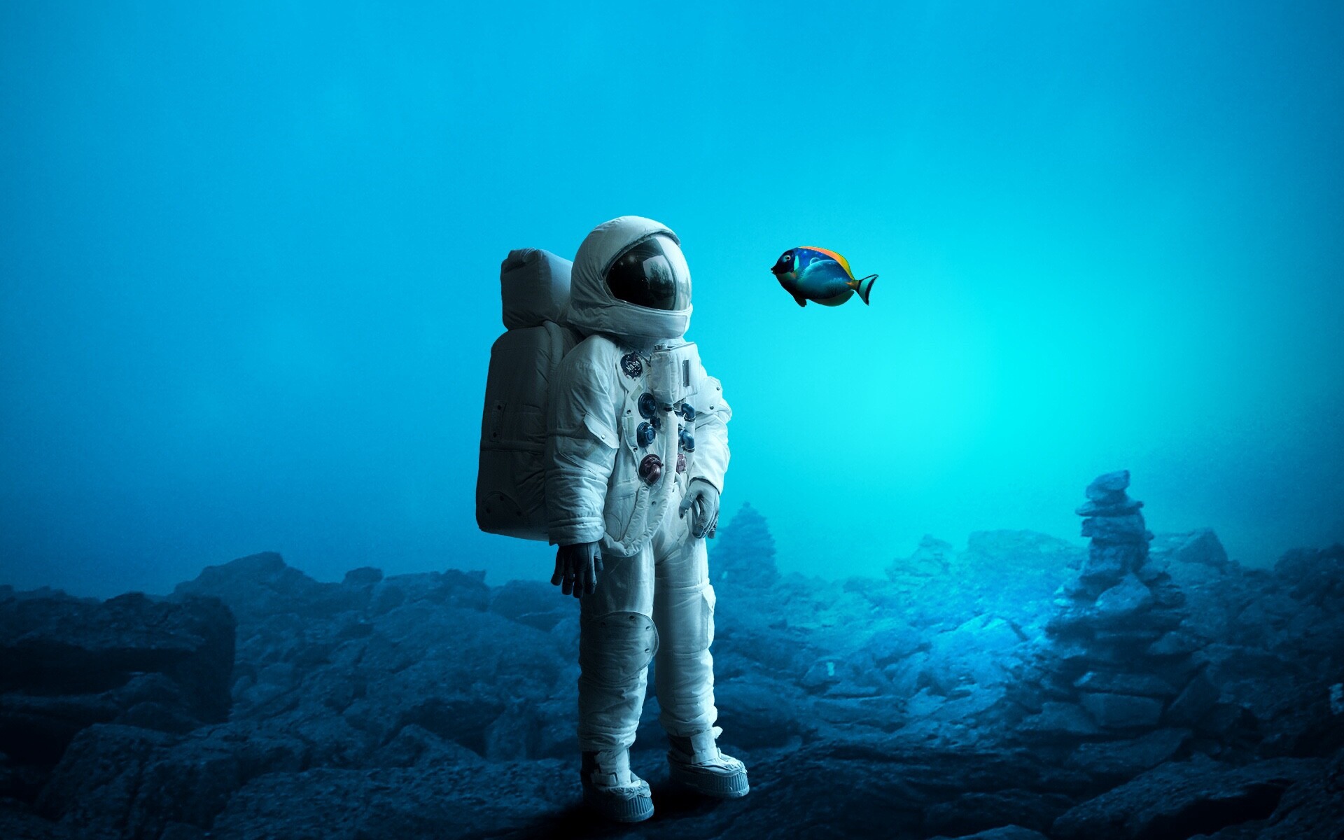 Description: A man in a space suit standing in the water with a fish in the background of the image.