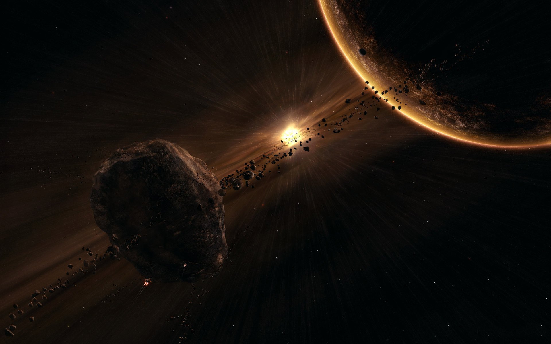 Description: A large object in the middle of a space with a bright light coming from it's center and a distant object in the distance.