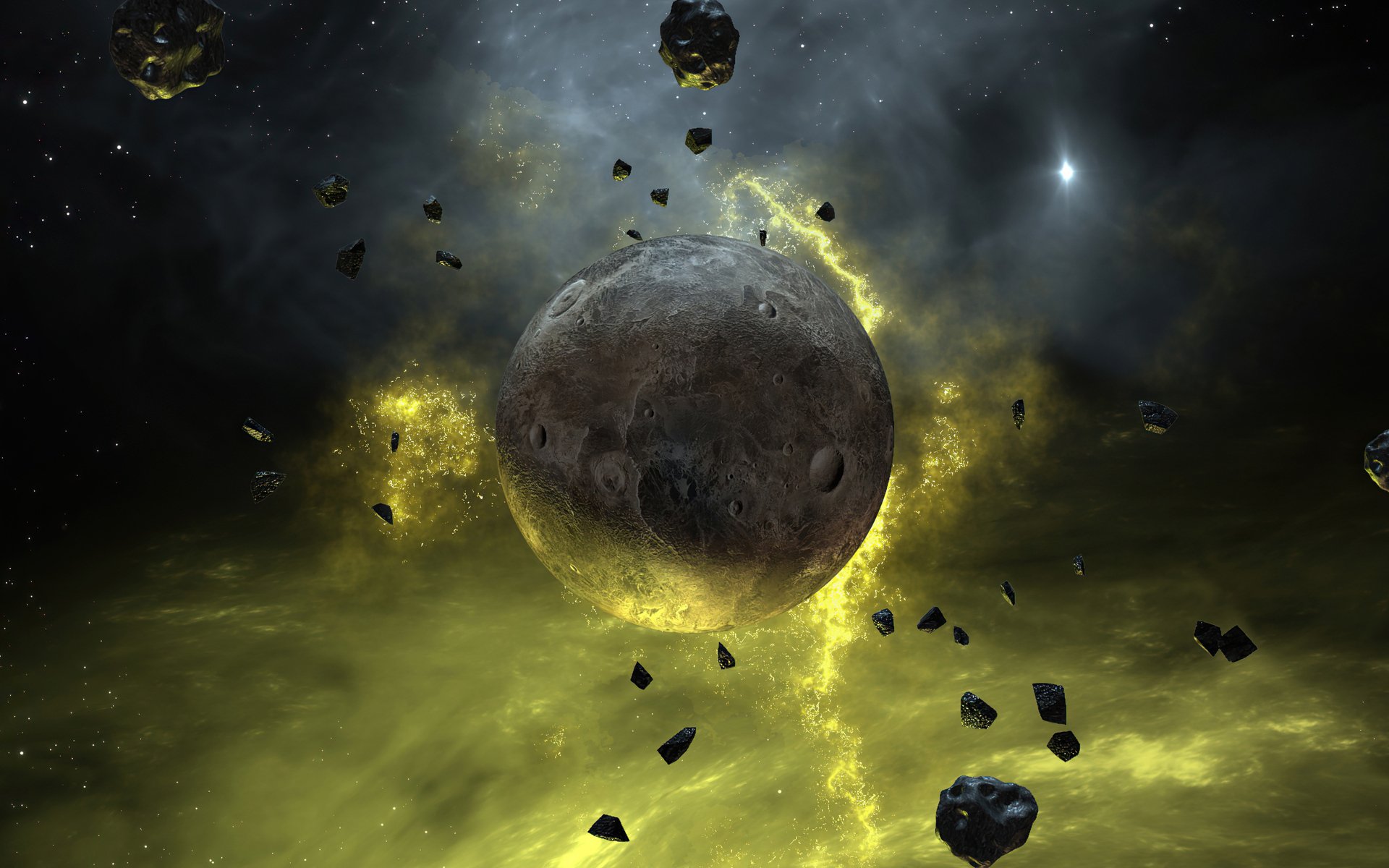 Description: A group of rocks flying through the air near a large object in the sky with a lot of rocks.
