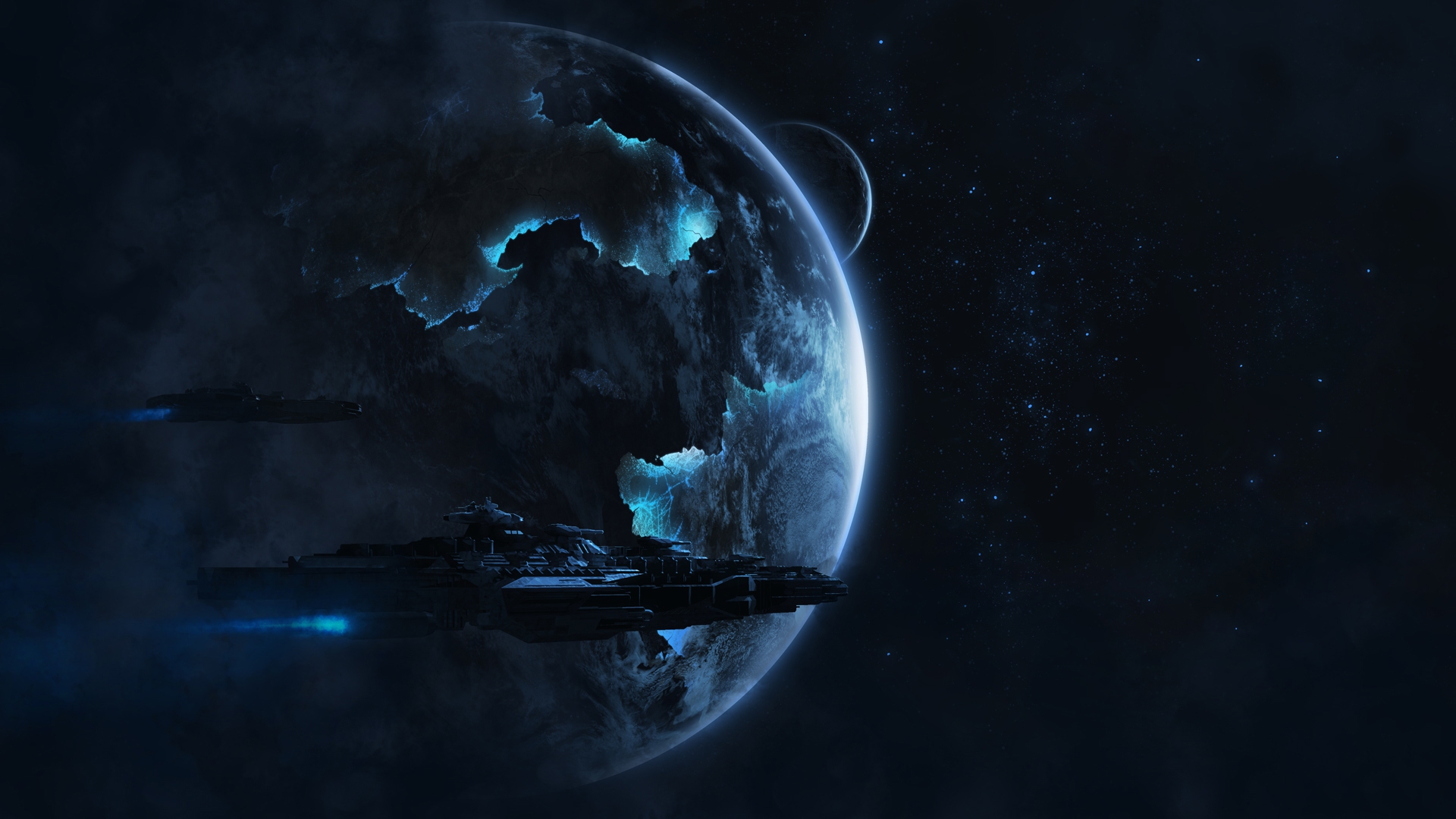 Description: A space ship floating in the middle of a blue planet with a star in the background and a blue light at the end of the scene.