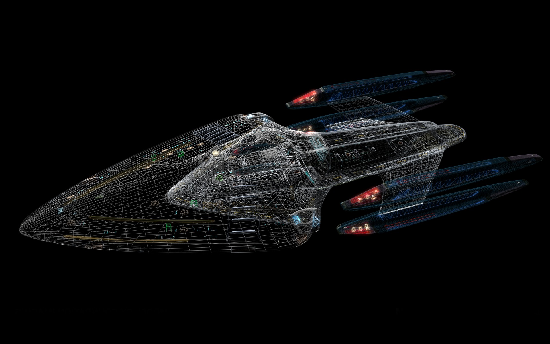 Description: A computer generated model of a space ship in flight with lights on the sides of the hulls and the wings.