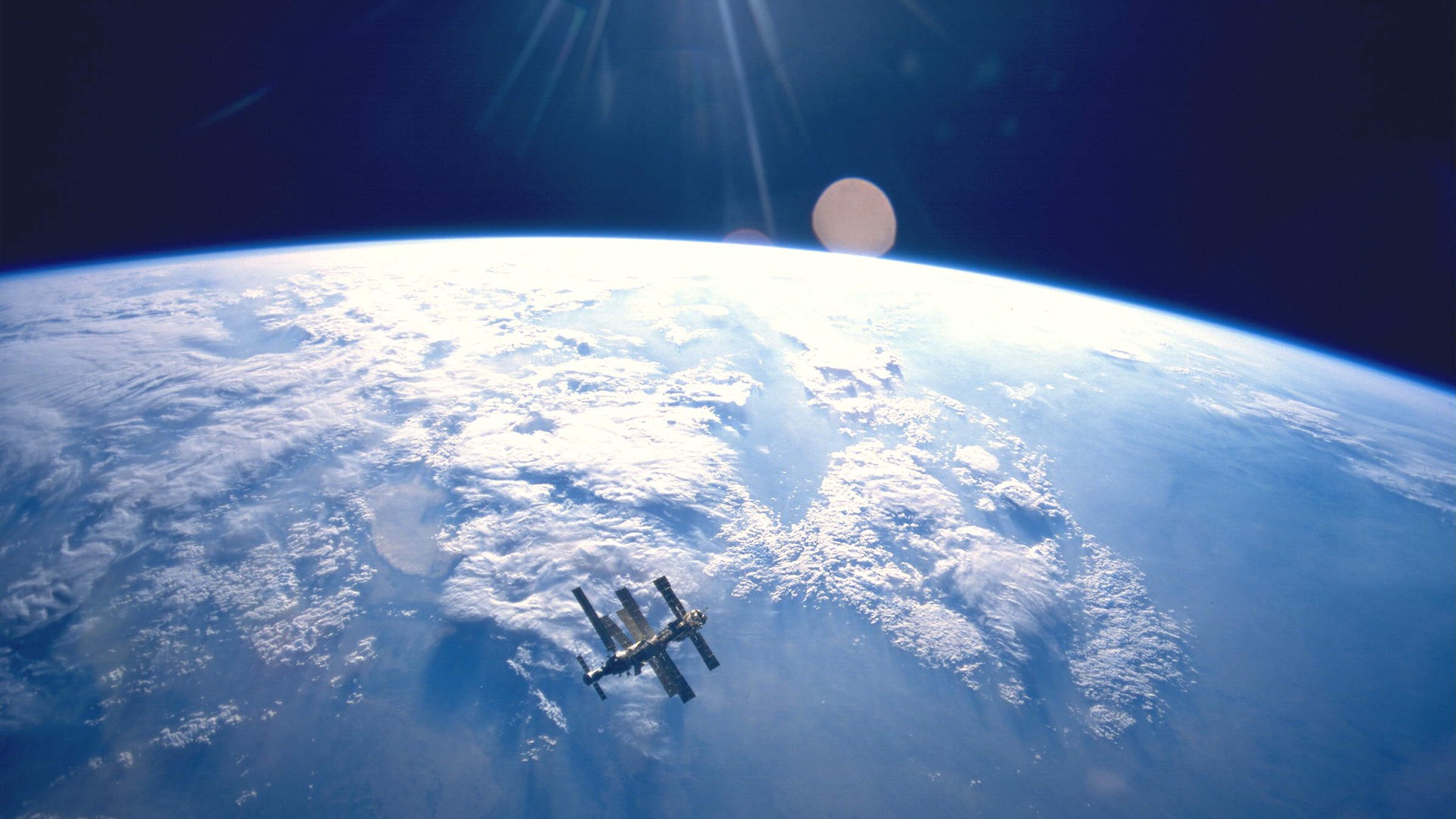 Description: A space shuttle flying over the earth in space with the sun shining above it and clouds below it.