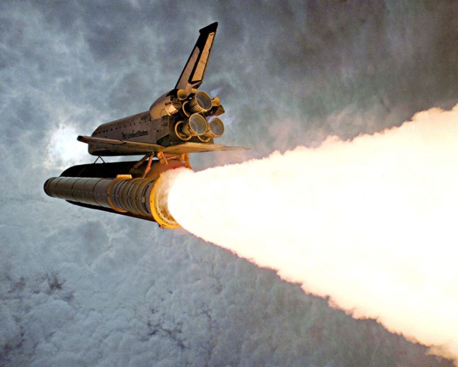 Description: A space shuttle is flying through the sky with smoke coming out of it's back end and landing on the ground.