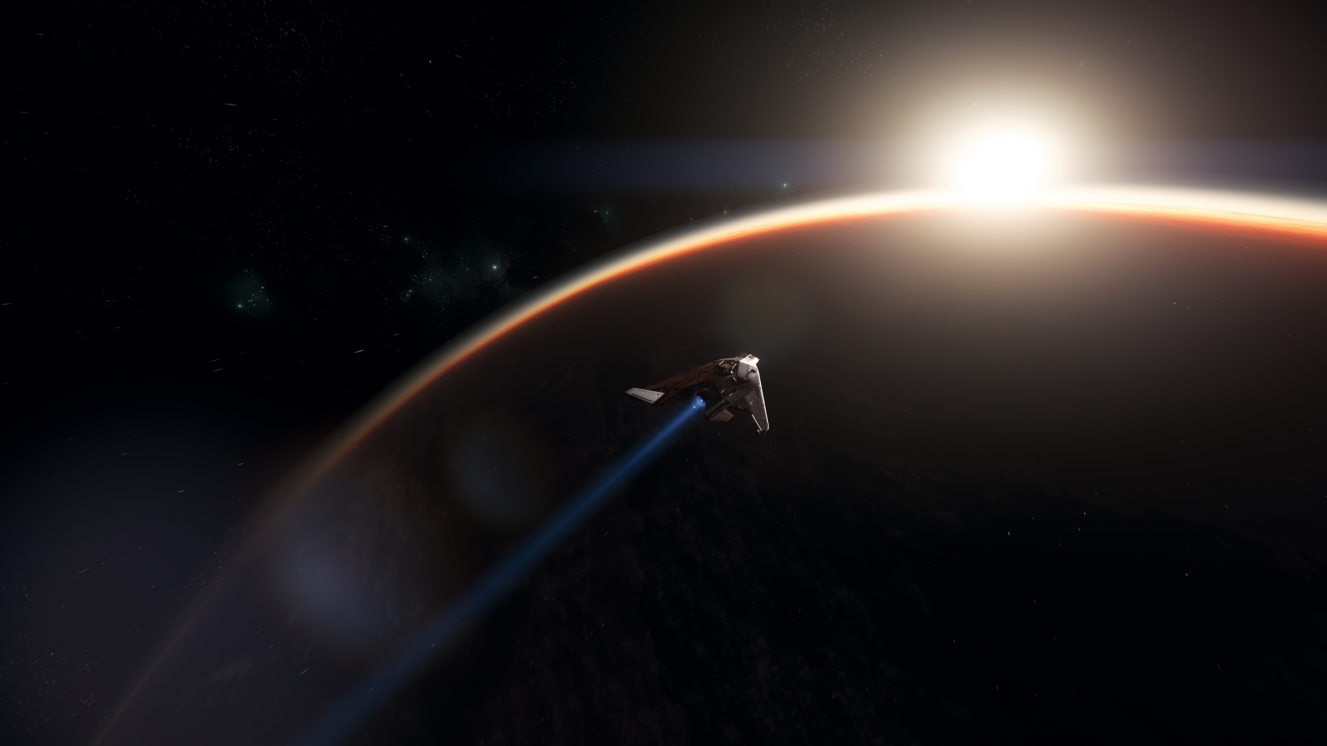 Description: A space shuttle flying through the sky above a planet with a sun flarer in the background and a bright light shining on the horizon.
