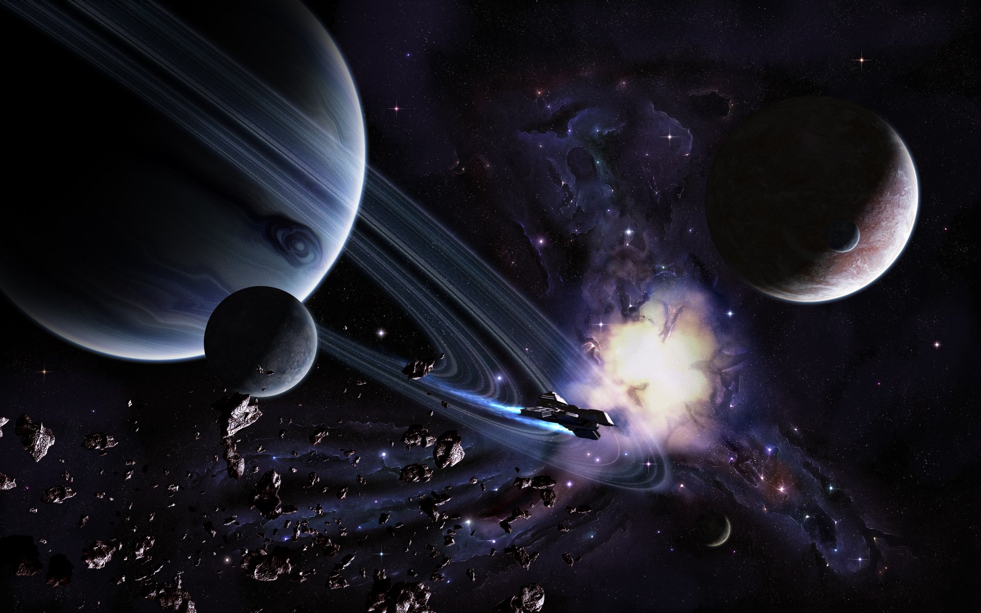 Description: A space scene with a star and a space shuttle in the foreground and a distant planet in the background.