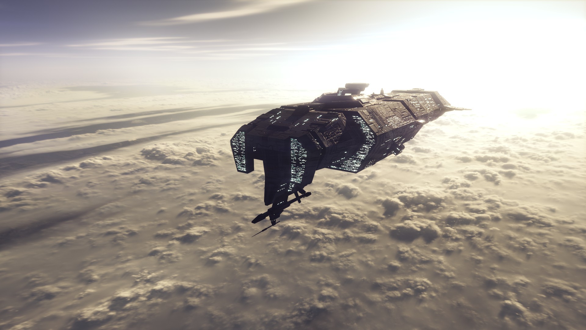 Description: A computer generated image of a space station in the sky above the clouds and snow covered ground.
