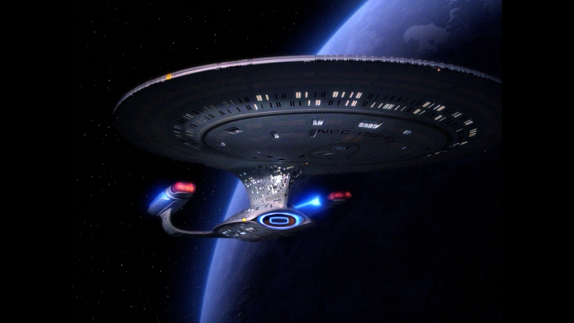 Description: A space station flying over the earth in space with a blue light on it's side and a red light on its side.