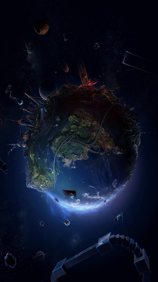 Description: A computer generated image of a space station in the middle of the earth with a view of the moon and planets.