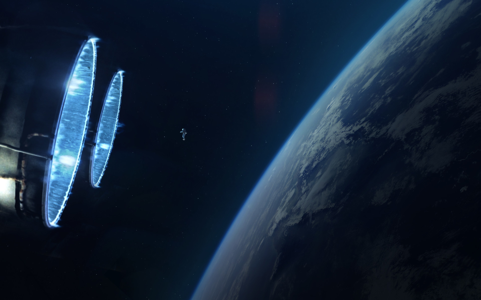 Description: A space station flying over the earth in space with a view of the earth and a space station in the distance.