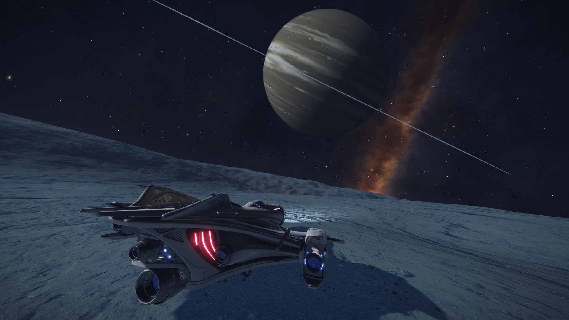 Description: A computer generated image of a space station on a moon surface with a distant object in the background and a distant object in the distance.